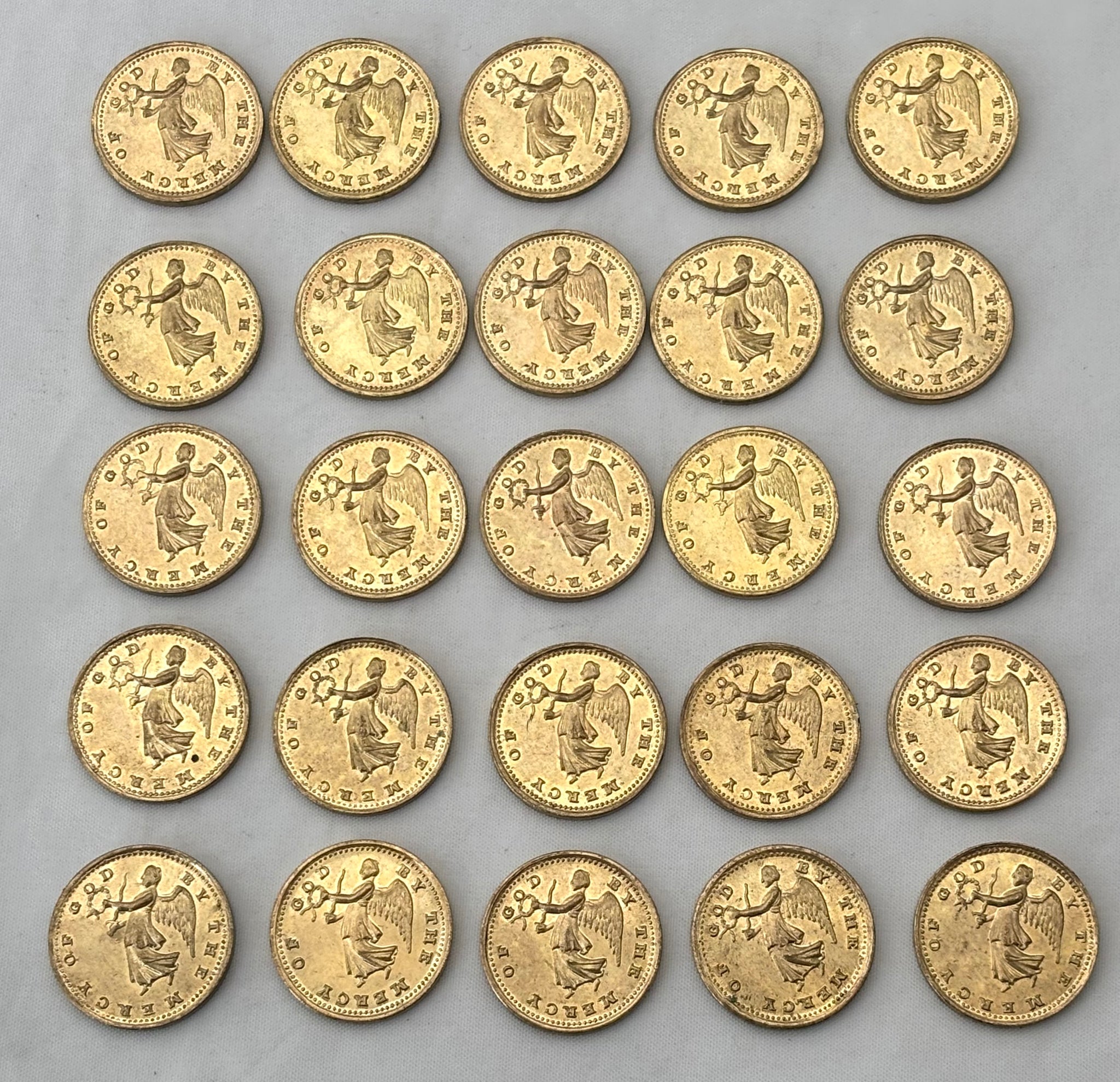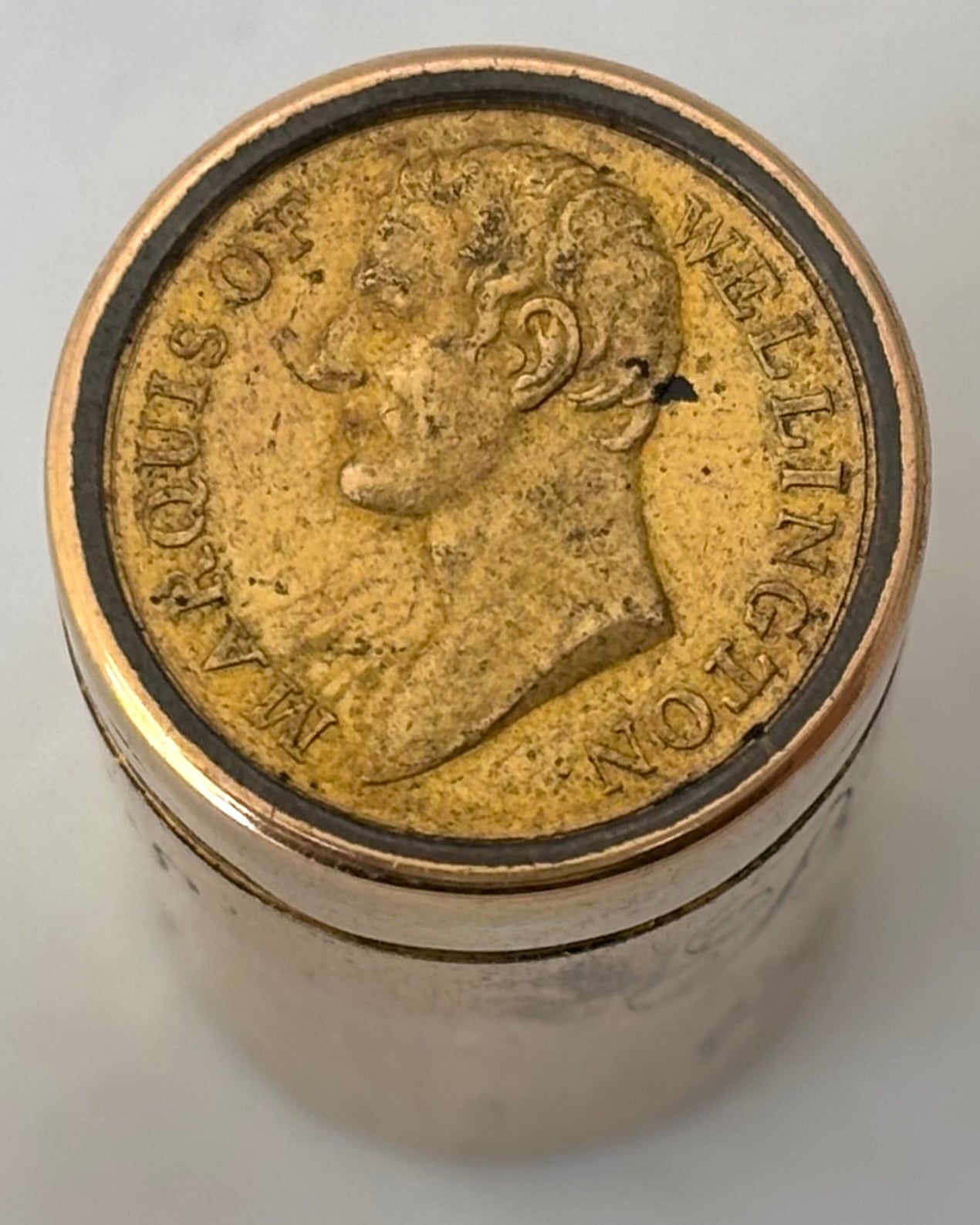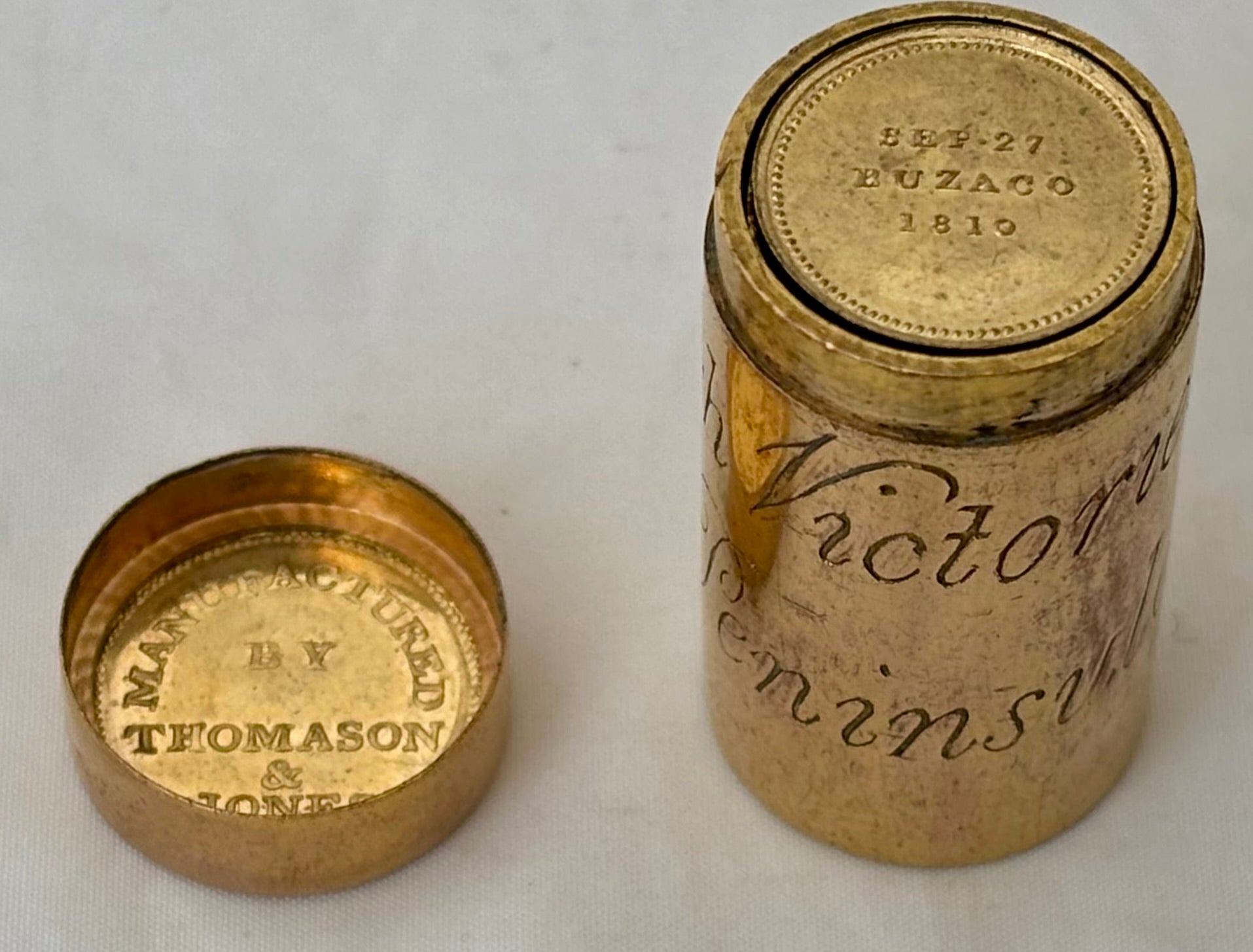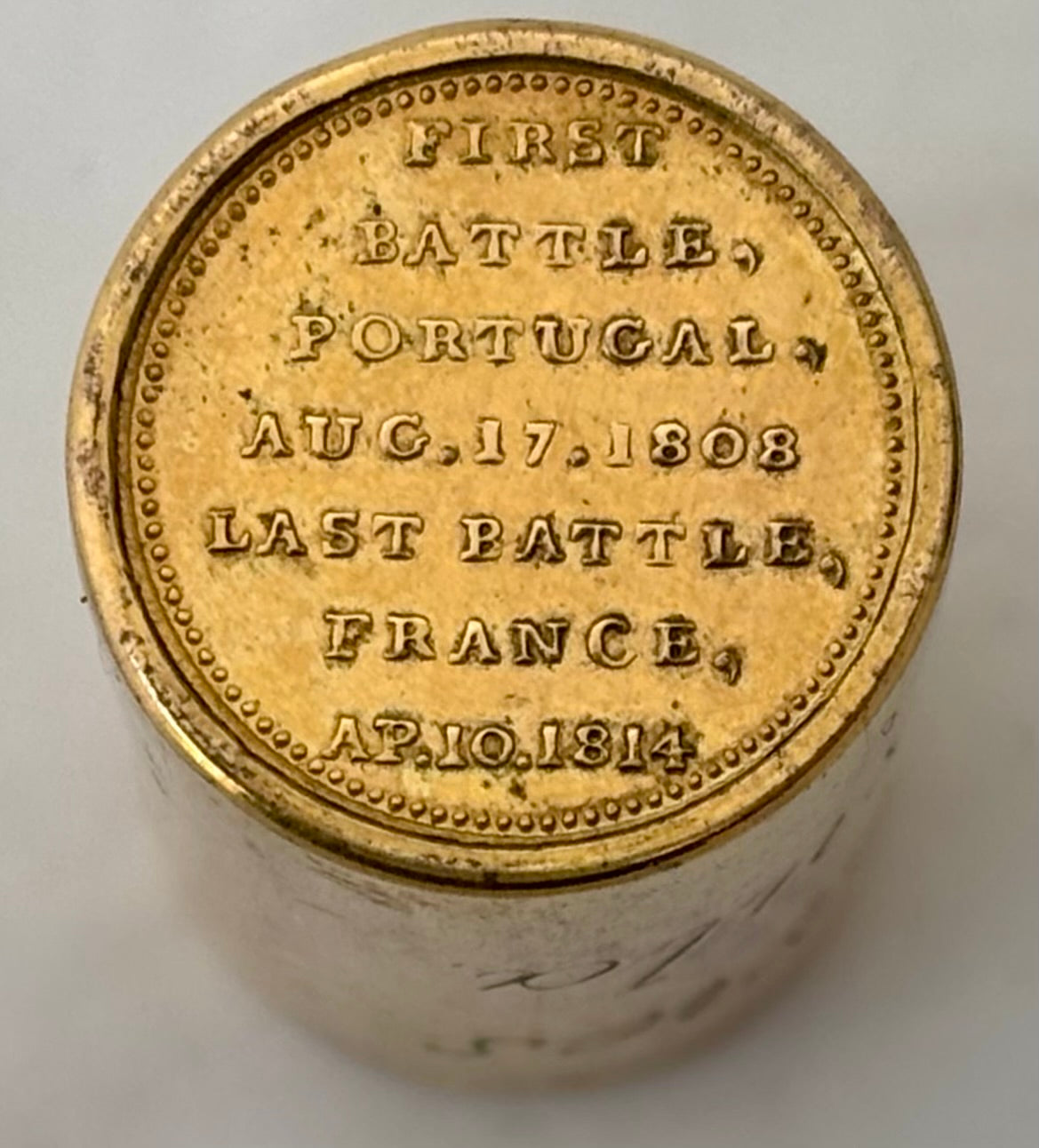 'British Victories in the Peninsula', An Early 19th Century Gilt Brass Commemorative Counter Box by Thomason & Jones. The Cover with Portrait Bust of 'Marquis of Wellington' and the Base Detailed 'First Battle, Portugal, Aug.17.1808 Last Battle, France, Ap.10.1814'. Contains Twenty Five Gilt Brass Medalets, each with Winged Victory and Battles.