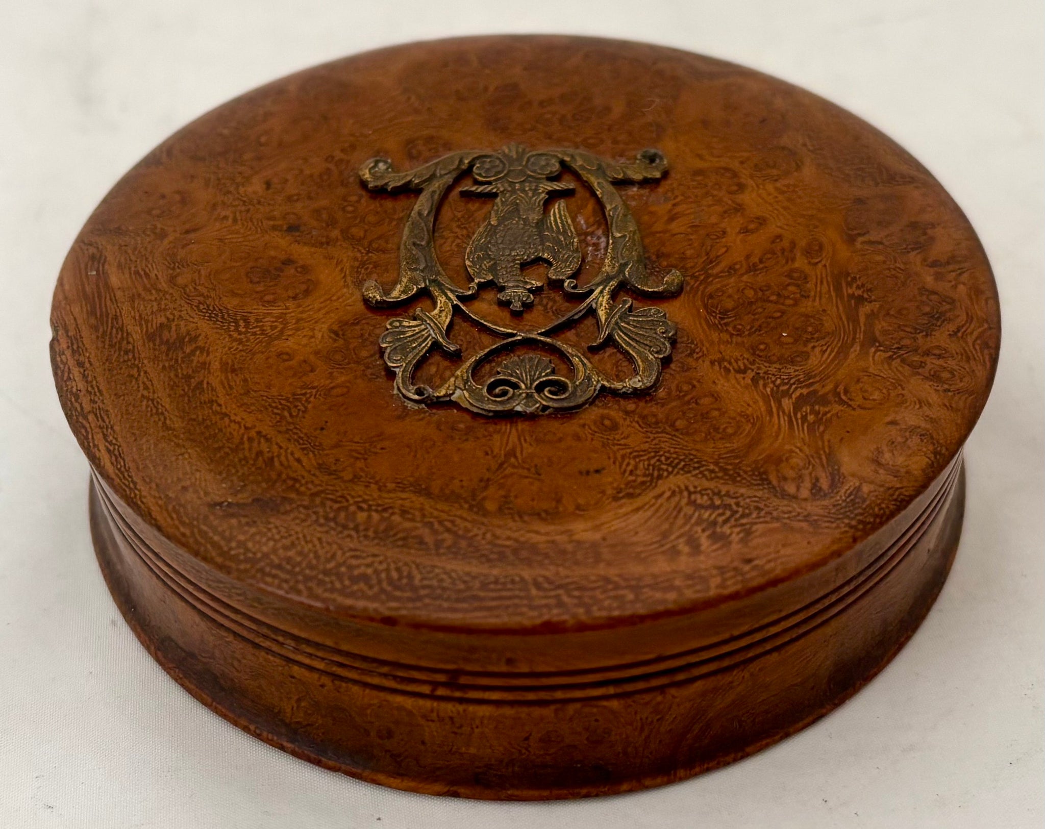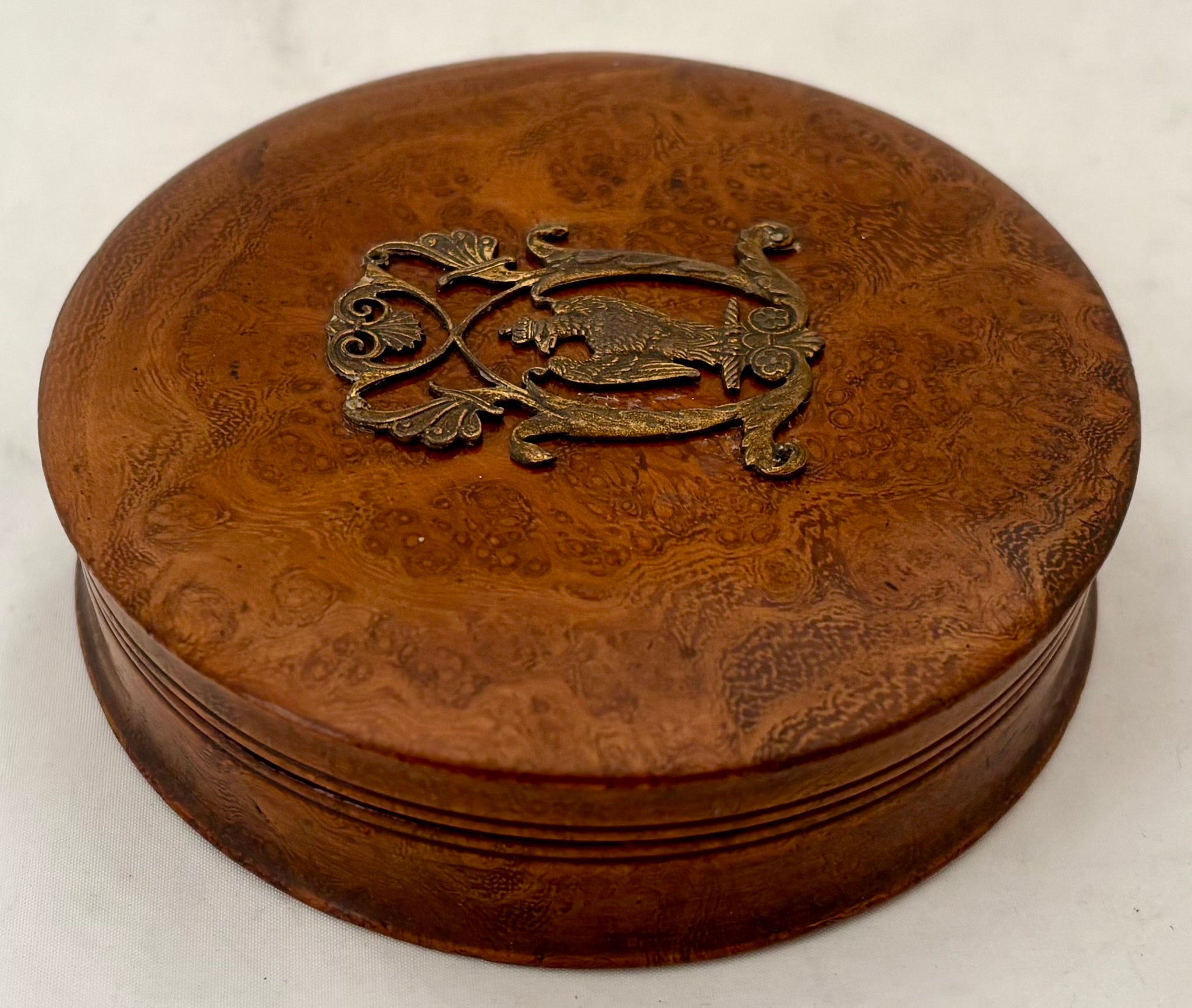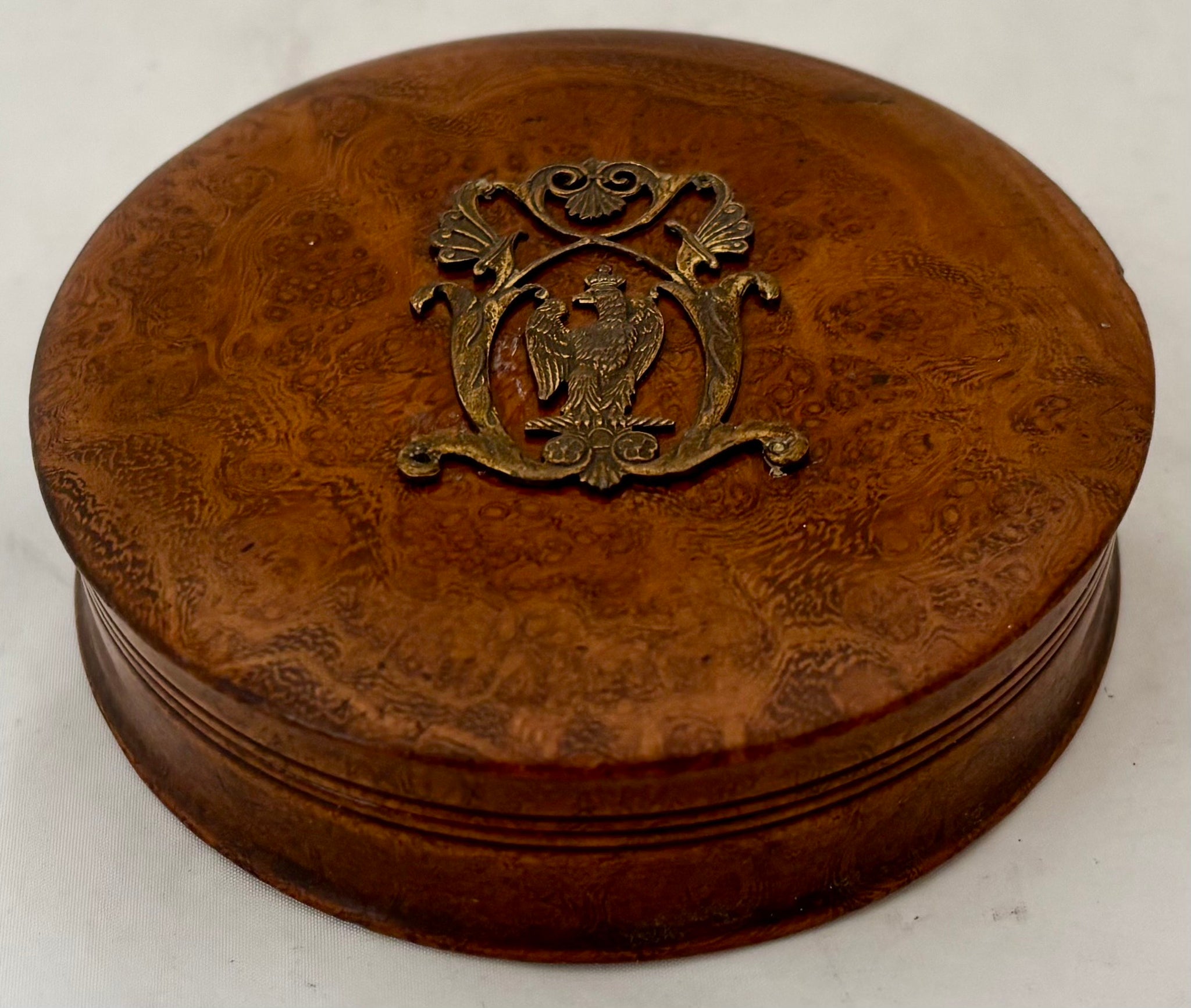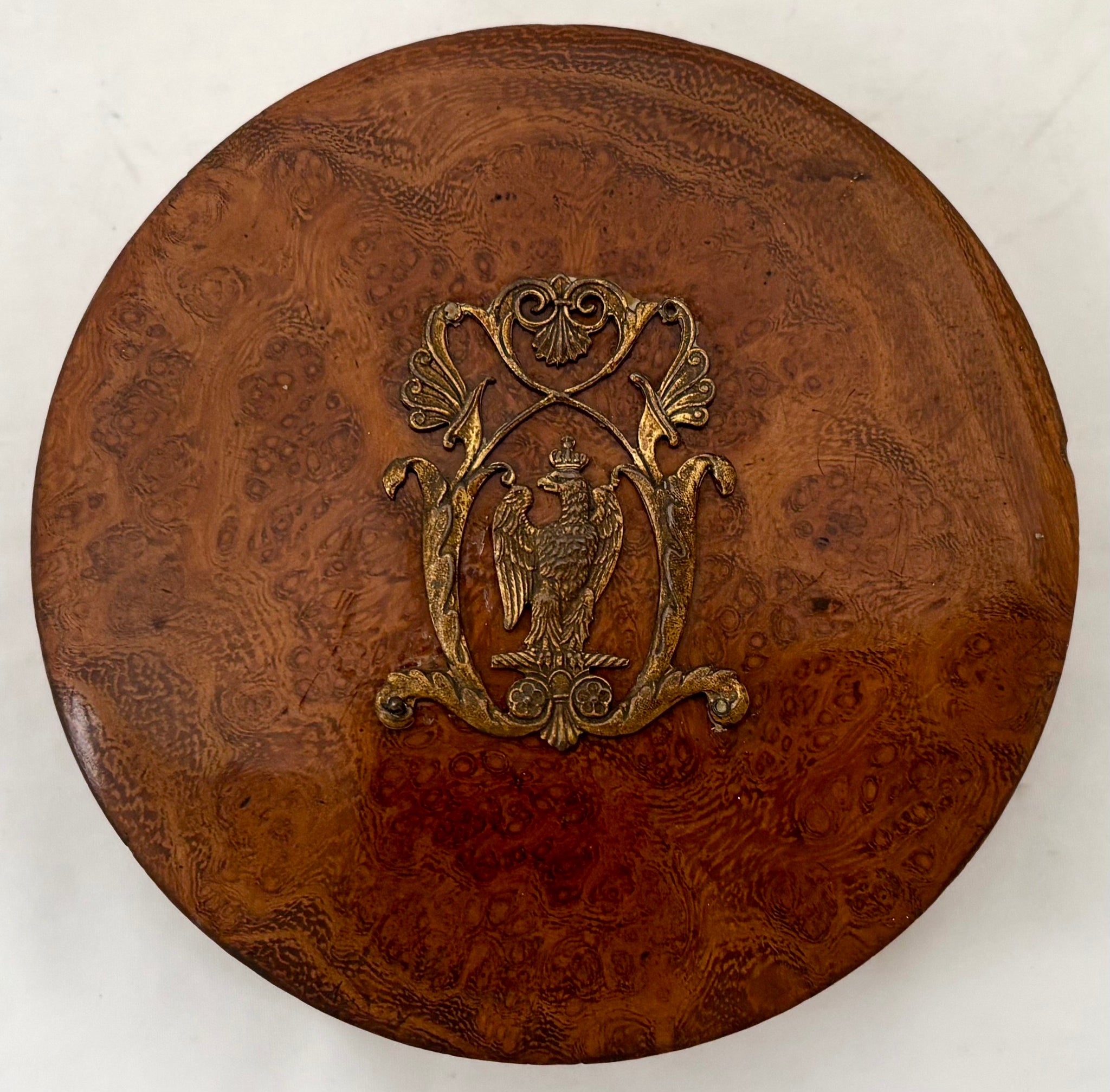 A French Empire Gilt Metal Mounted Burr Wood Waisted Form Circular Table Snuff Box, the Push-Fitting Cover Applied with an Imperial Crowned Eagle, circa 1830.
