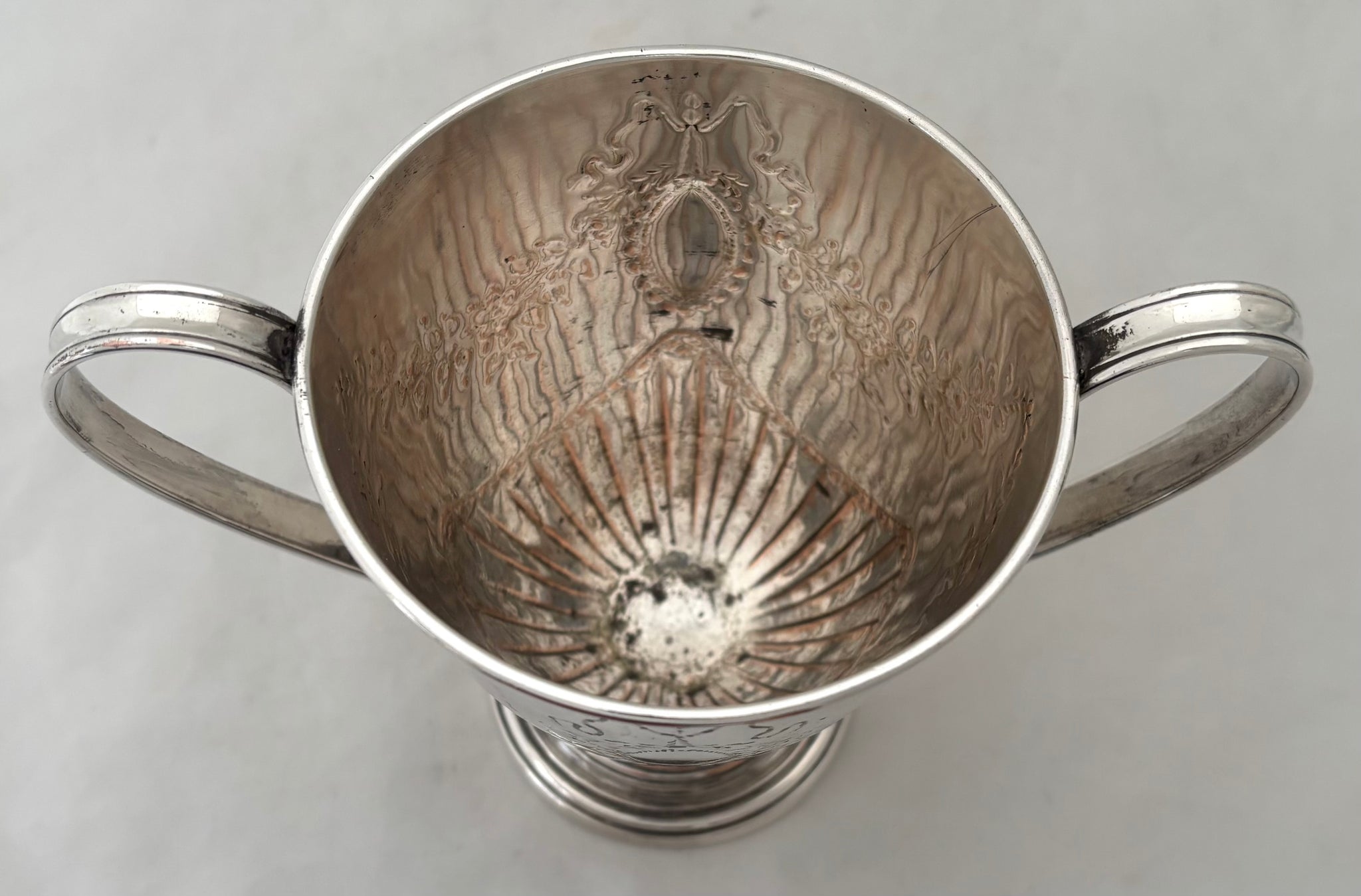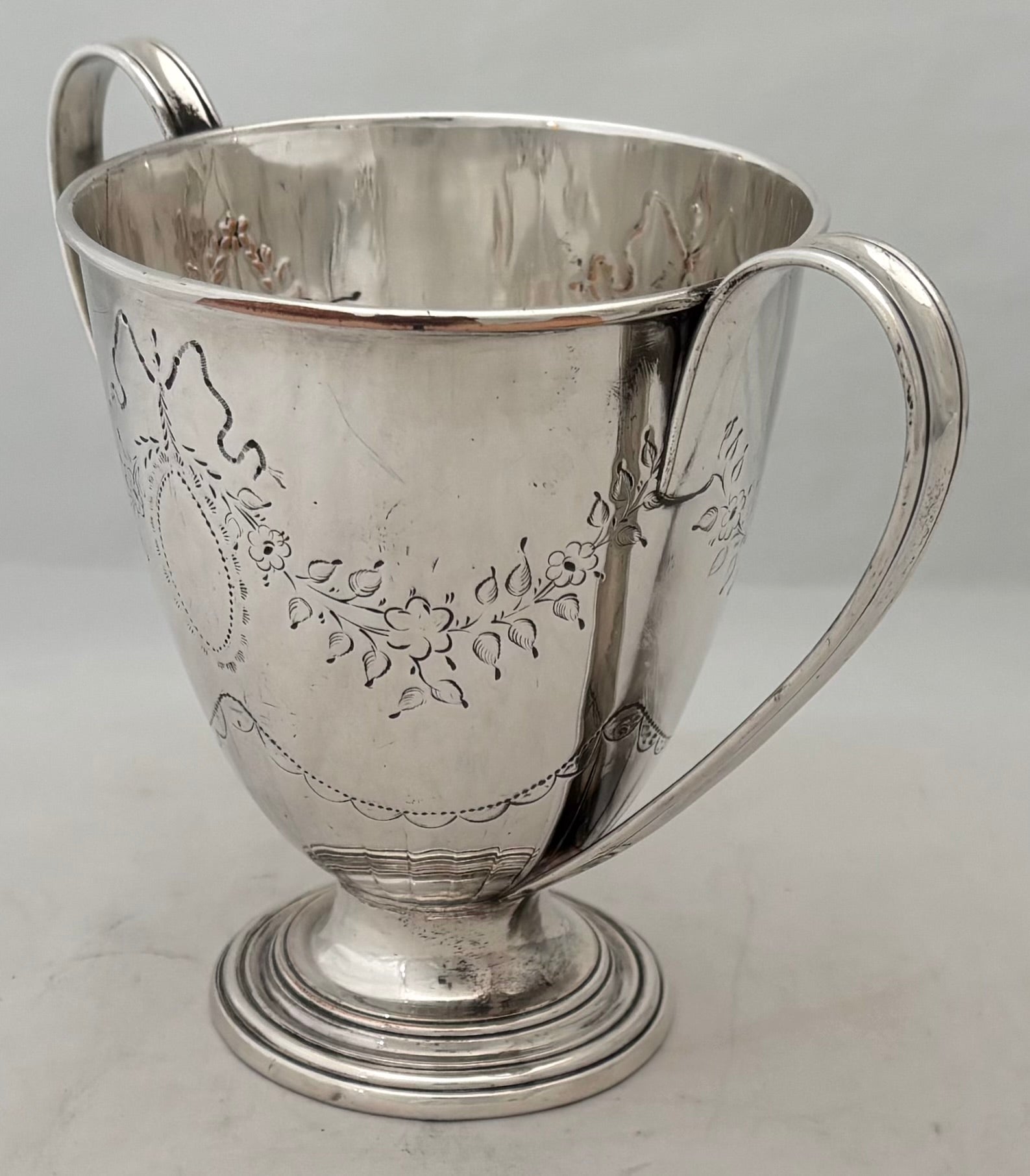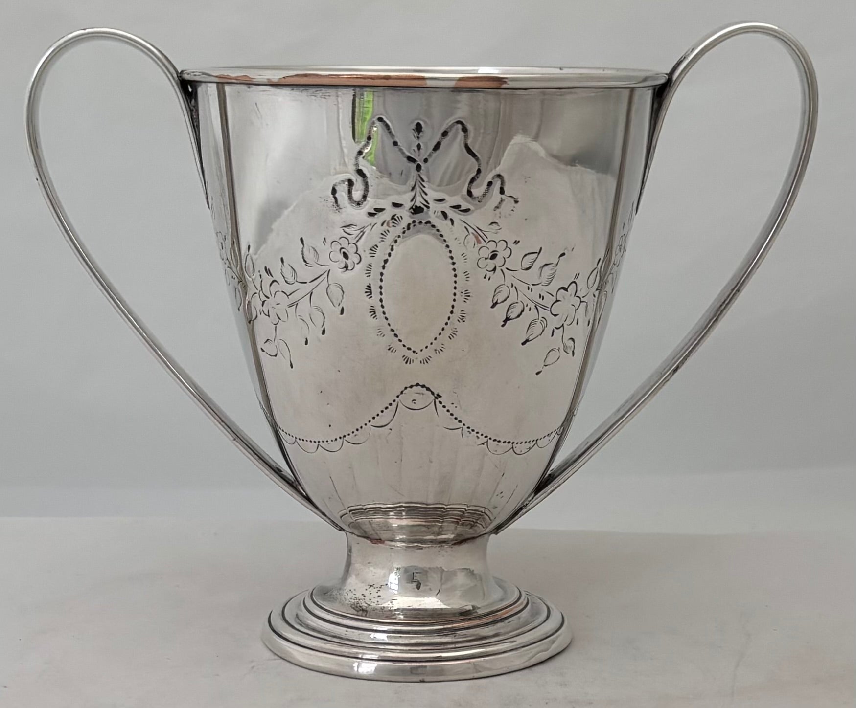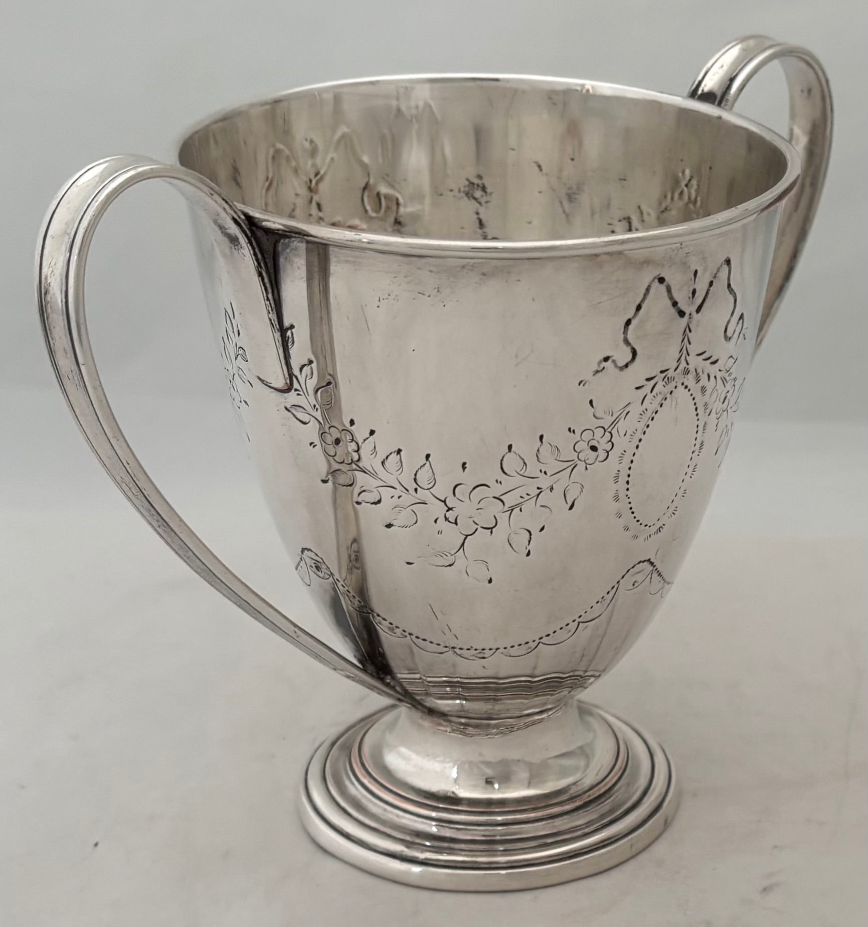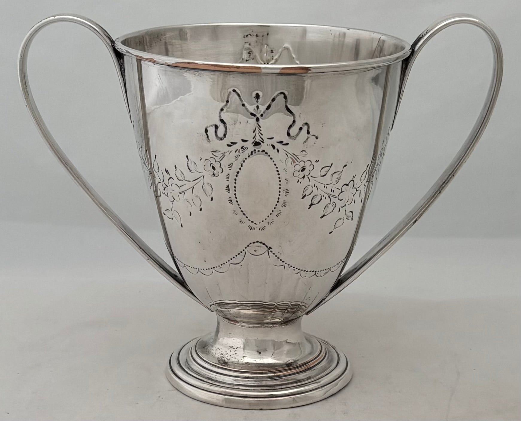 George III Old Sheffield Plate Loving Cup, circa 1790. Features twin reeded handles, fluting, foliate garlands and a reeded circular foot.