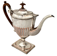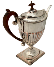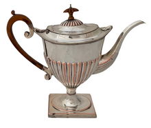 George III Old Sheffield Plate Pedestal Teapot, circa 1780 - 1800. Of vase shape form with fluted detail and a hinged cover on a square foot.