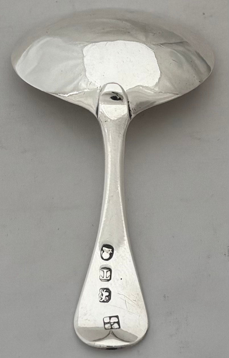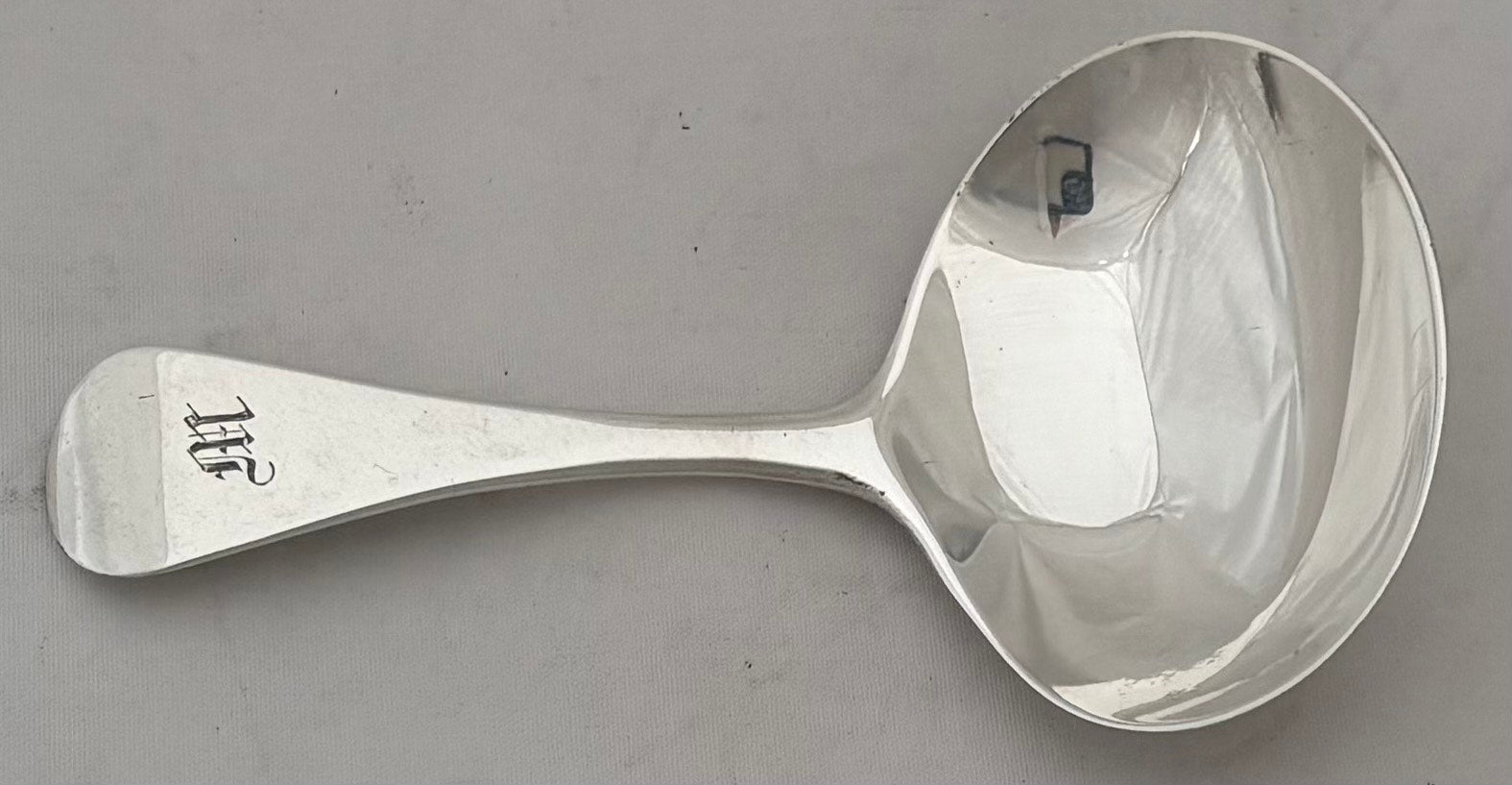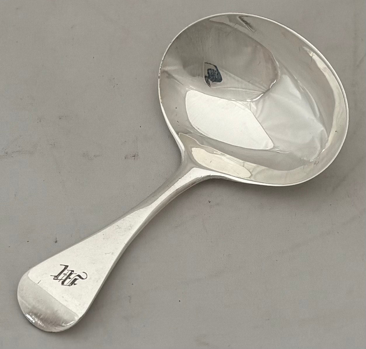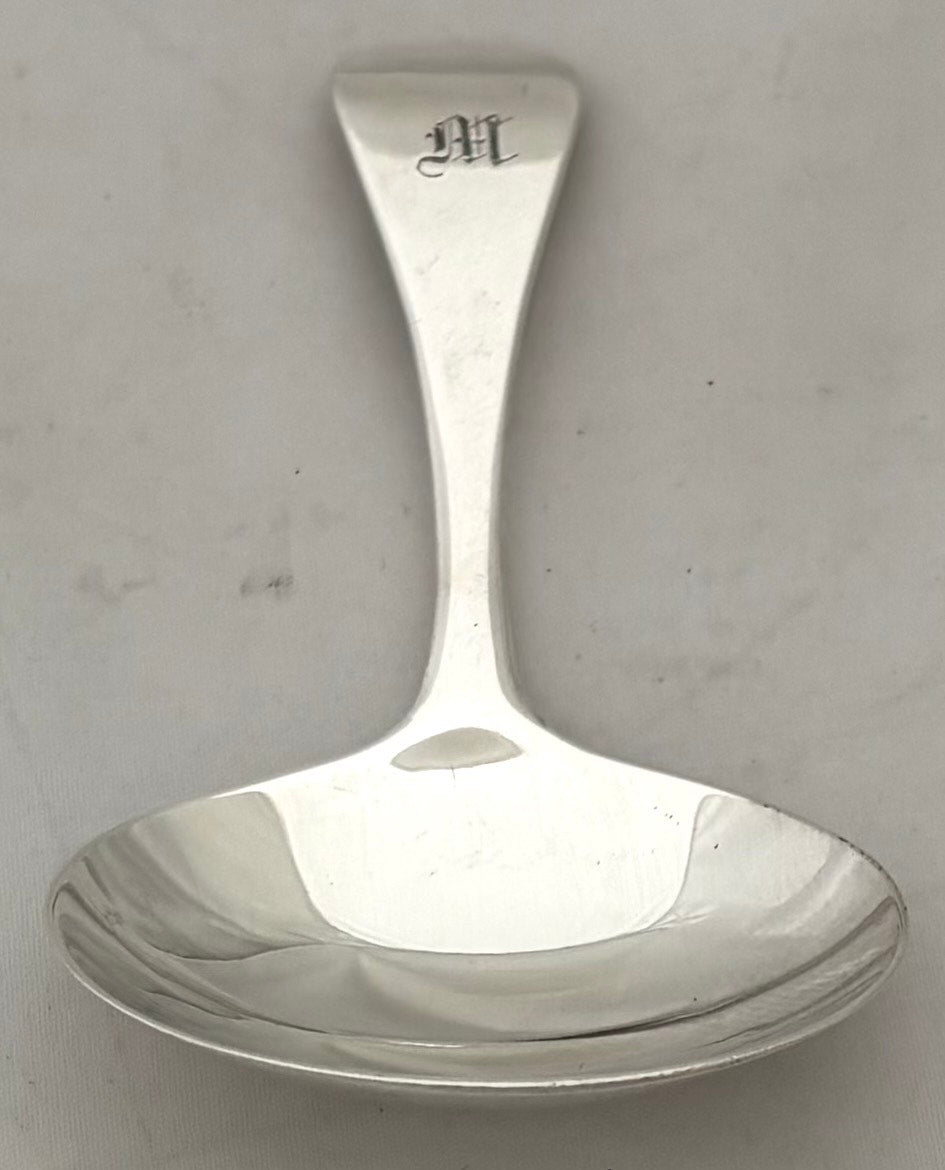 George III Silver Caddy Spoon. Of Old English pattern form with the initial M in gothic script to the terminal.