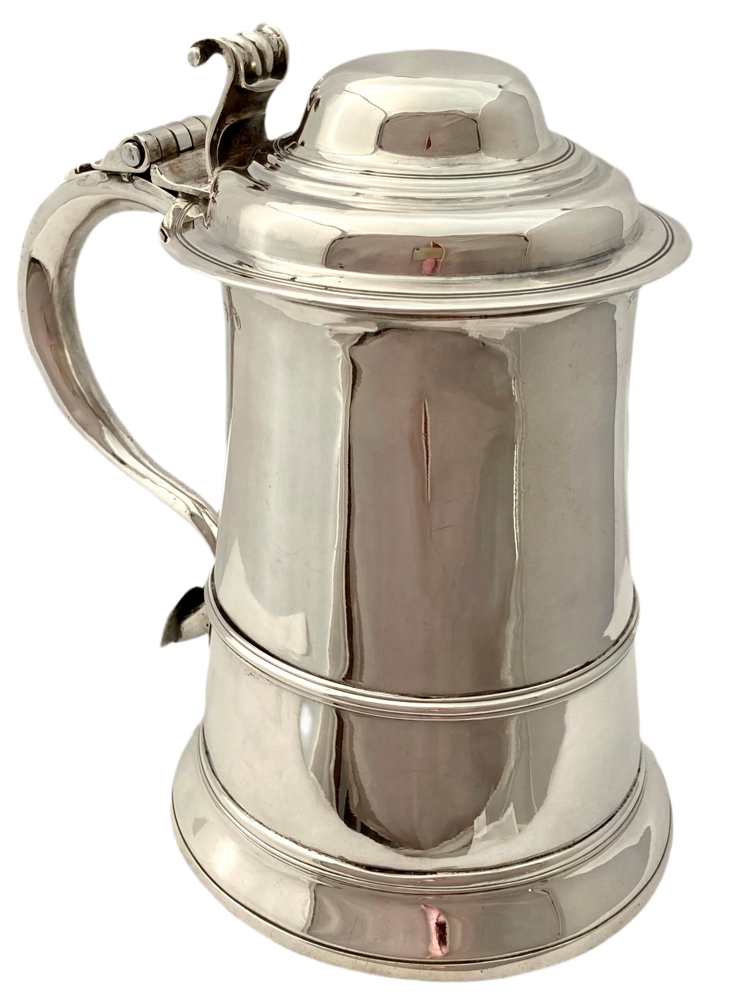 Georgian, George III, Silver Tankard. Of tapered form with a reeded girdle to the centre of the body and a skirted base. The hinged and domed cover with reeded detail. The handle with scroll thumb piece and heart shaped terminal. Free of any inscriptions, monograms, or later chasing. The tankard is watertight and holds about 980 ml, full to the brim.