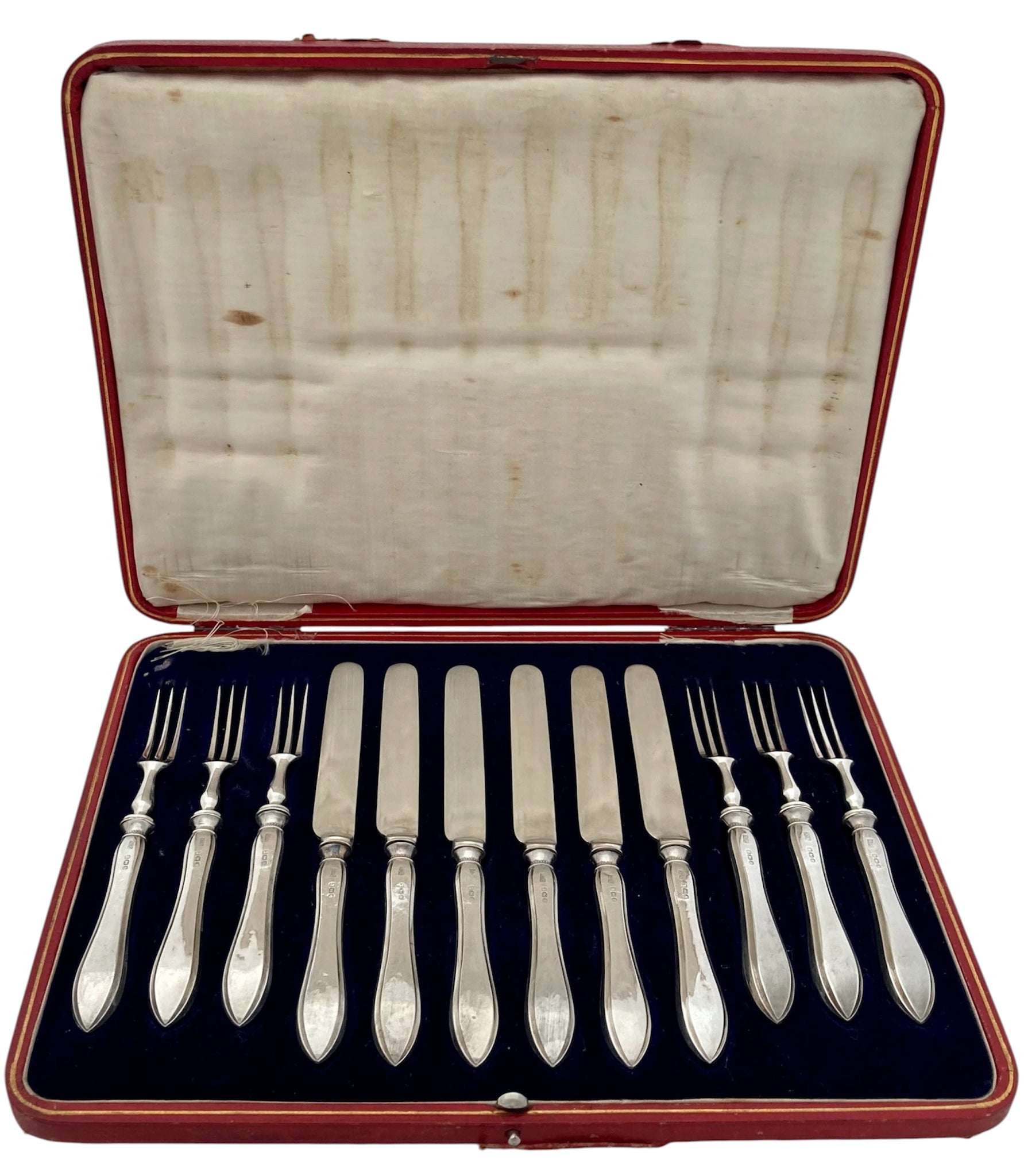 George V Cased Set of Silver Handled Dessert Knives & Forks for Six. The handles are silver and the blades/prongs are silver plated.