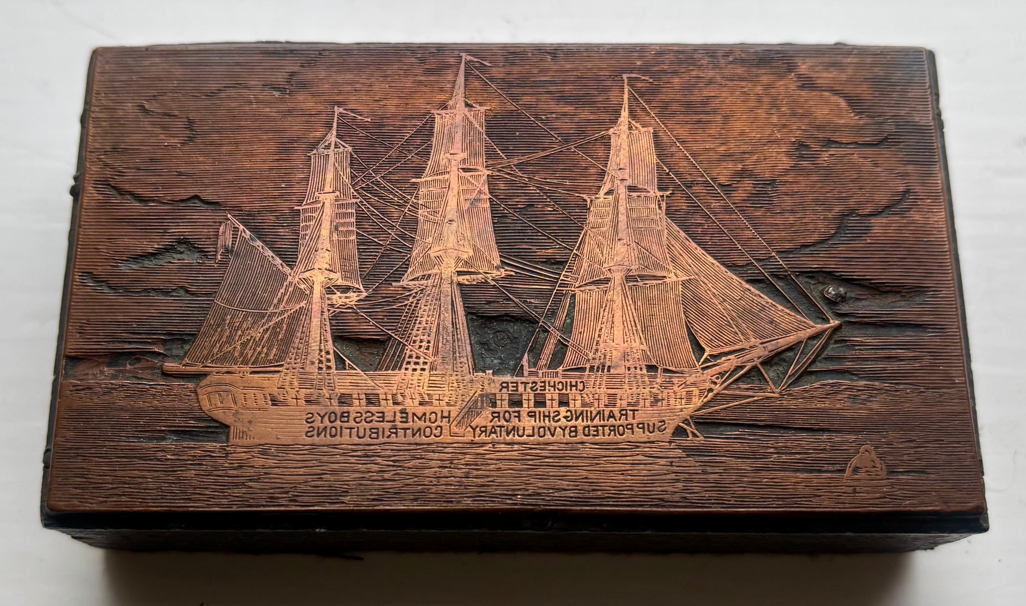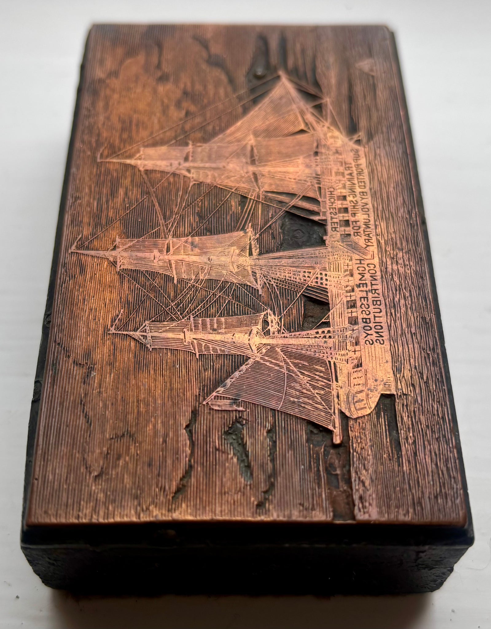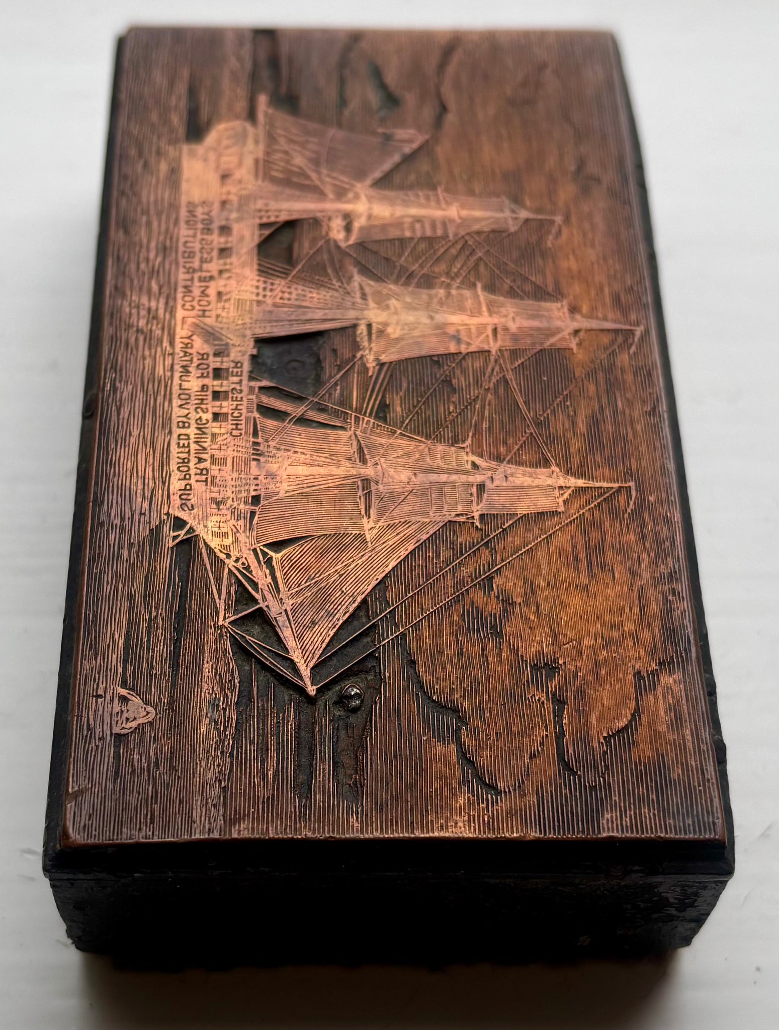 HMS Chichester Copper on Wood Printing Block with Reverse Image of the Ship.