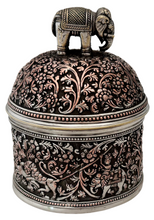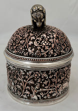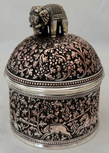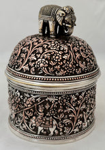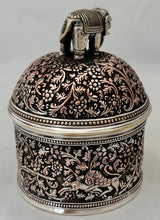 Indian Lucknow Hunting Style Silver Plated Cylindrical Box and Domed Cover with Elephant Finial. Elkington & Co. circa 1870 - 1880. Beaded detail to the borders.