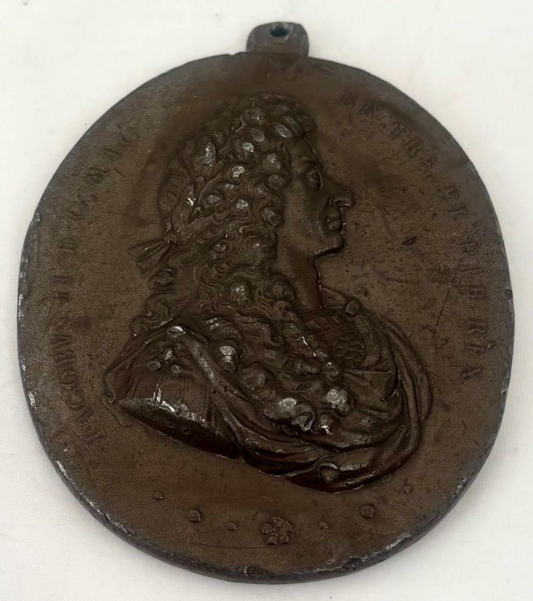 James II (1633 - 1701) Bronzed Metal Uniface Portrait Profile Bust Medallion. Of oval form with a suspension loop. The legend around the medallion reads: