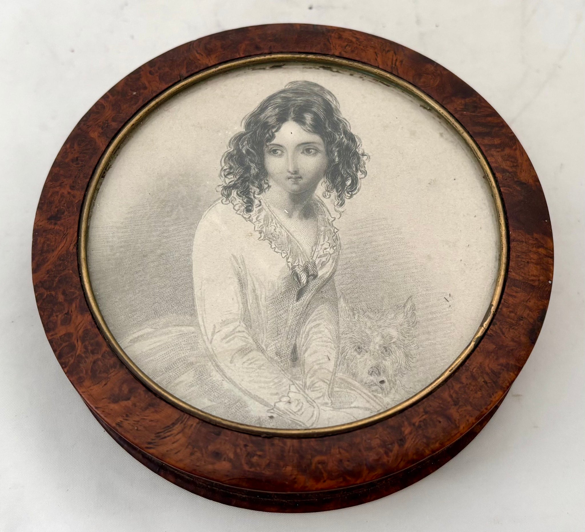 A 19th Century Amboyna Waisted Circular Table Snuff Box, the Glazed Push-Fitting Cover Set with a Monochrome Print of a Young Girl and her Dog, circa 1840.