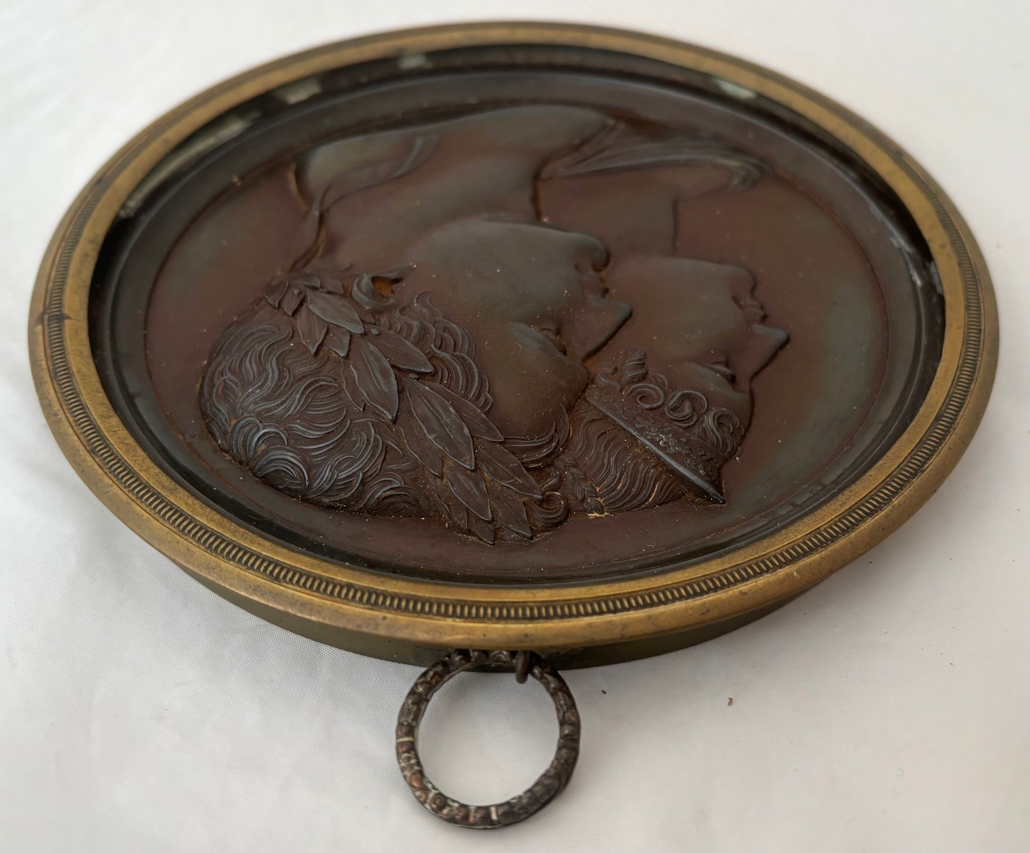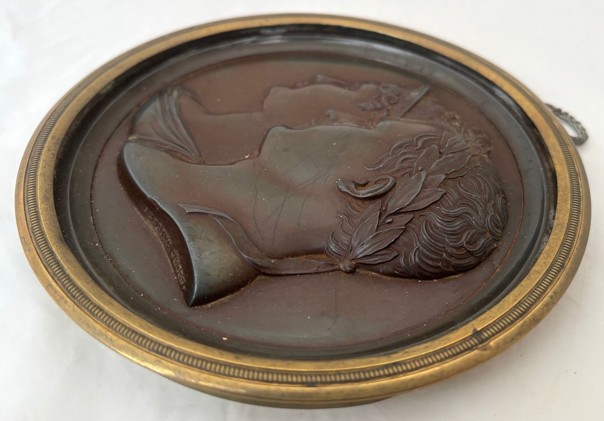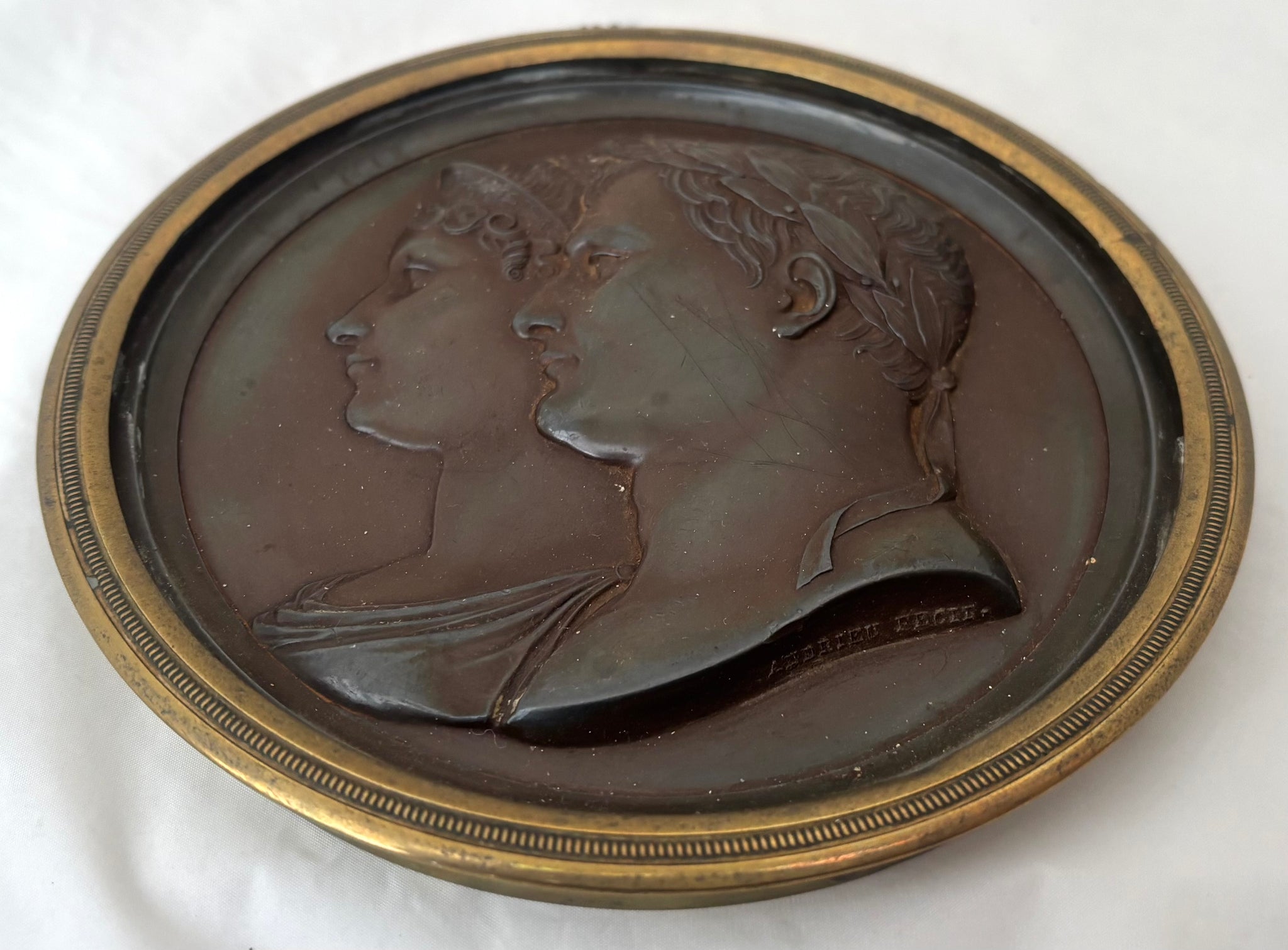 Napoleon Bonaparte & Marie Louise, Duchess of Parma, Bronze Portrait Profile Plaque, After Andrieu. Housed in a gilt metal roundel frame, with suspension loop.