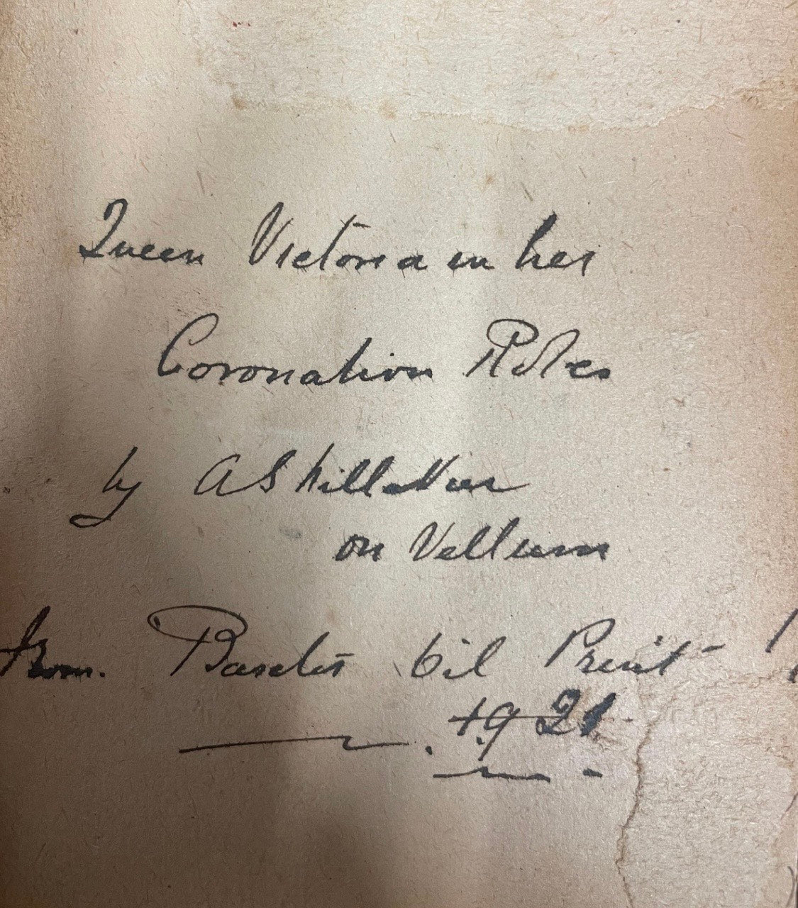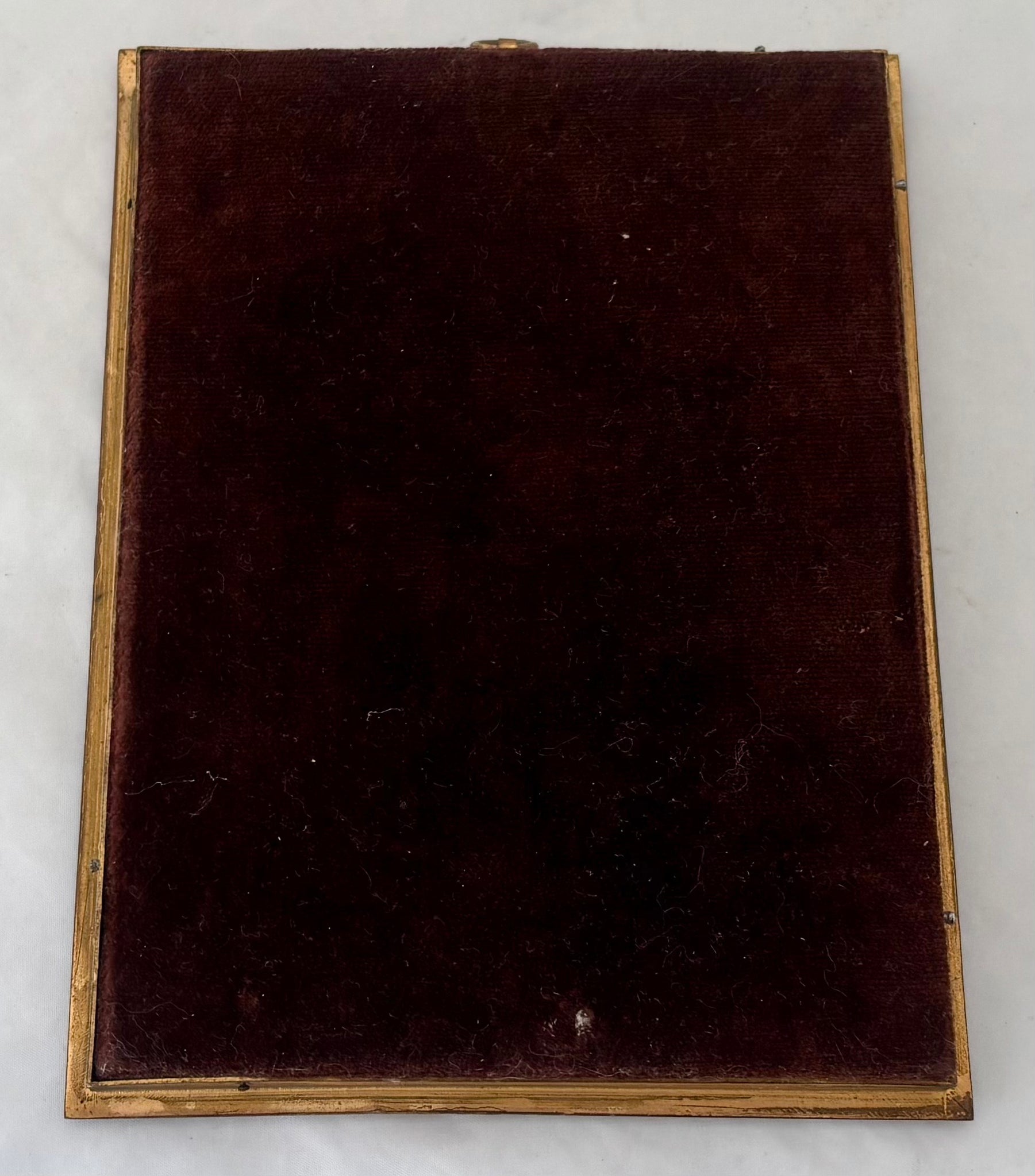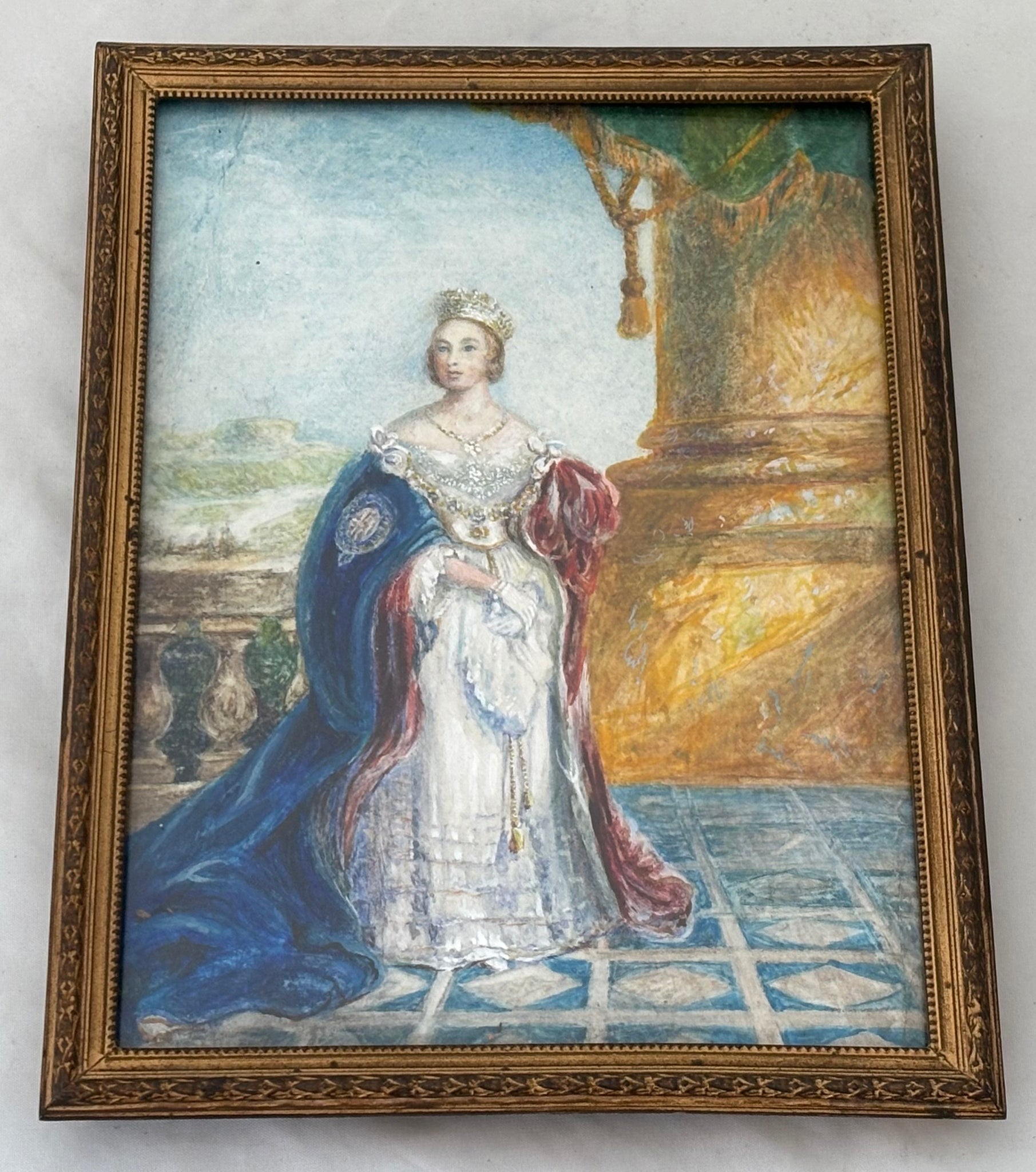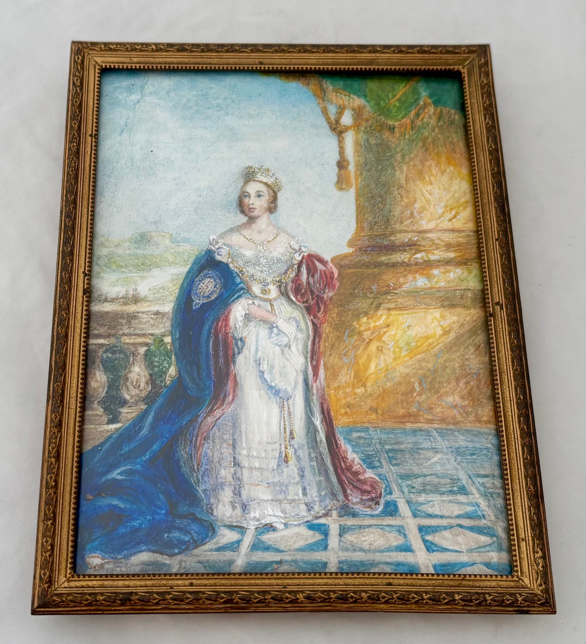 Queen Victoria in her Coronation Robes, English Naive School Watercolour on Vellum, Circa 1921, After the George Baxter Print. In a gilt metal frame with a velvet covered rear.