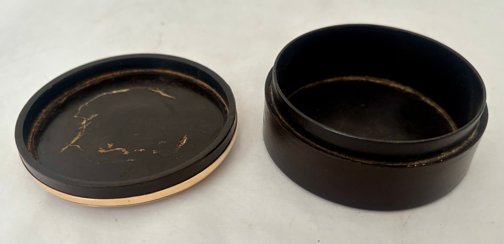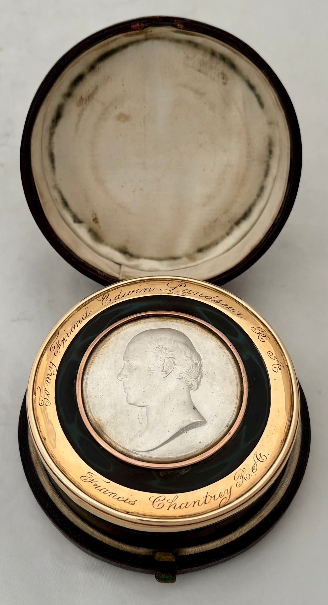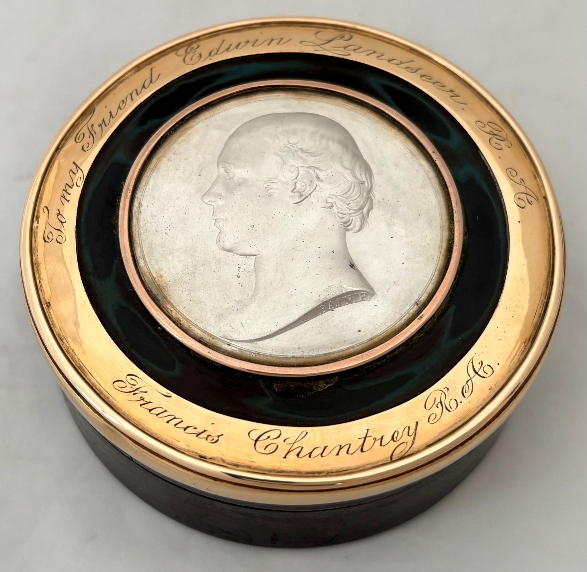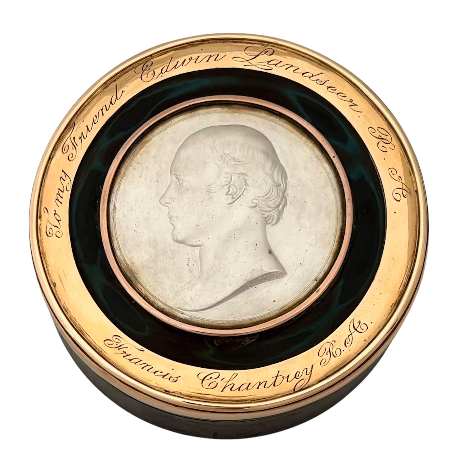 Sir Francis Leggatt Chantrey RA (1781 - 1841) and Sir Edwin Henry Landseer RA (1802 - 1873) Gold Mounted Lacquered Circular Snuff Box with a White Metal Portrait Profile Relief of Chantrey by William Bain. The Border of the Box with Presentation Inscription from Chantrey to Landseer. Housed in a Fitted Case and Circa 1825 - 1840. Chantrey was the Leading Portrait Sculptor in Regency Britain, with George IV on Horseback, in Trafalgar Square, being one of his most notable. Landseer was Best Known for his Sculpture of the Lions at the Base of Nelson's Column, Trafalgar Square and his Paintings of Animals.