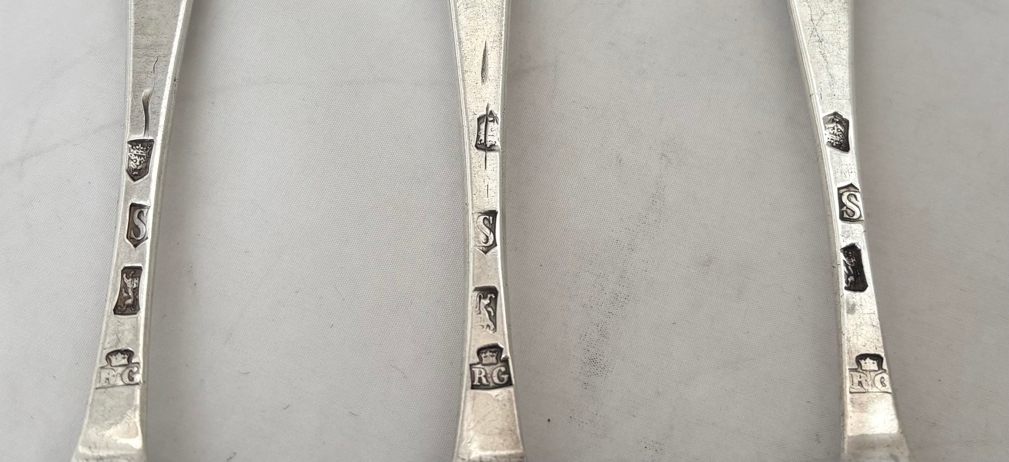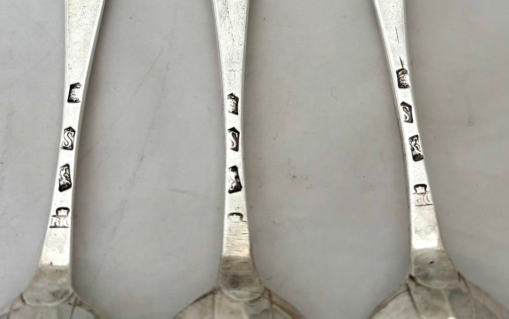 In good condition with well defined bowl tips and sides. A little clouding of the silver and surface marks commensurate with age and use. This set is free from dents, creases and repair.