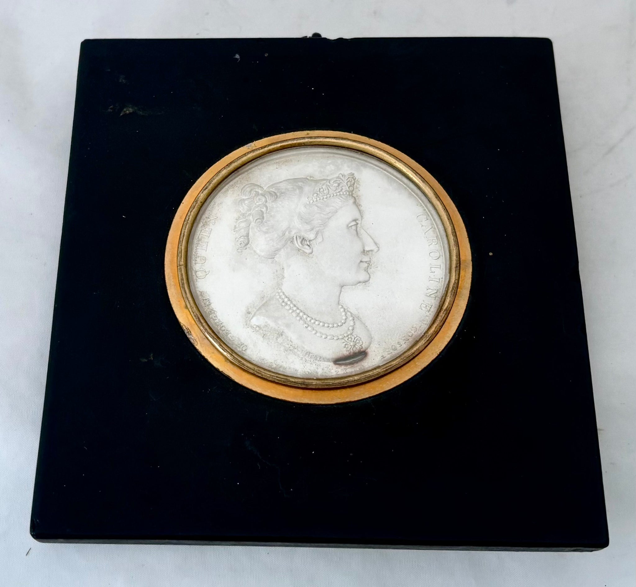 The Accession of Queen Caroline, Consort of George IV, White Metal Medallion in an Ebonised Frame. After Peter Rouw & George Mills, circa 1820.