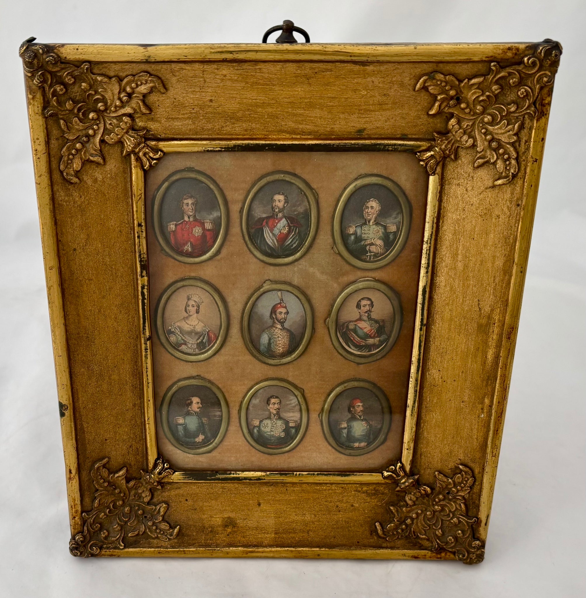 The Crimean War Allied Leaders, A Set of Nine Coloured Print Portraits, After George Baxter. The portraits are of Lord Raglan, the Duke of Cambridge, Sir Charles Napier, Queen Victoria, the Sultan of Turkey, Napoleon III, Marshal Canrobert, Marshal St Arnaud, and Omar Pasha, in Period Velvet Mount and Gilt Brass Frame.