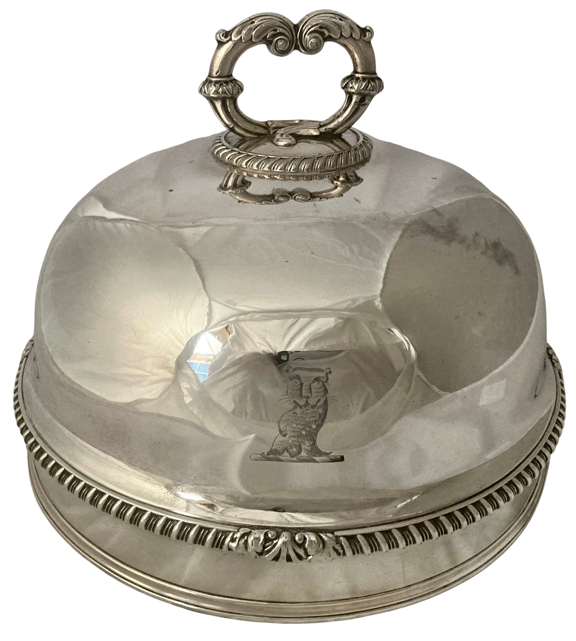 Matthew Boulton Early Victorian Silver Plated Crested Game Meat Dome. Features a wonderful crest of a leopard or tiger in the naive style. Gadrooned rims and an acanthus capped scroll handle.
