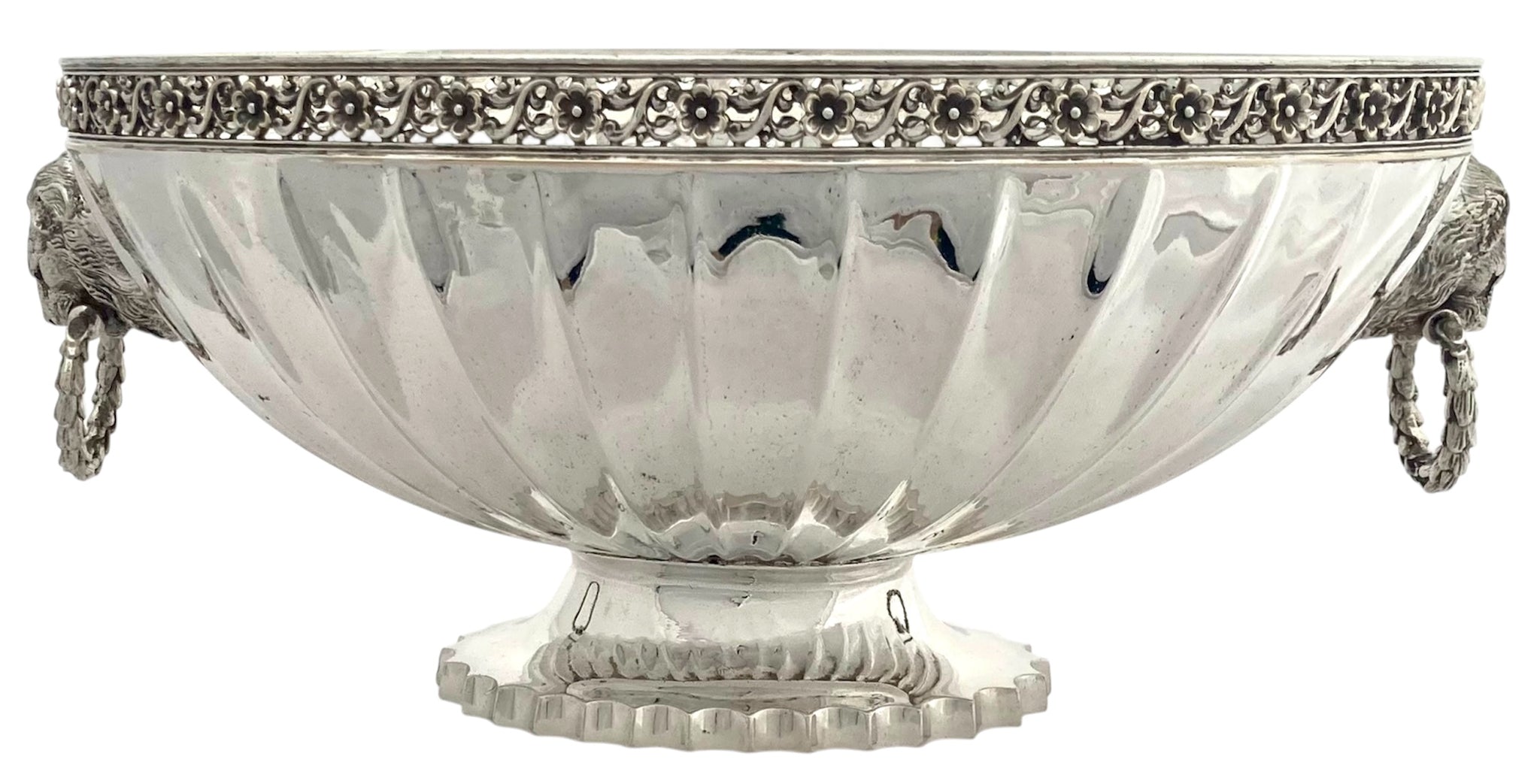 Victorian Silver Plated Oval Fluted Bowl with Lion Mask Ring Handles. The top rim with pierced foliate detail. Raised on a crimped oval pedestal foot.