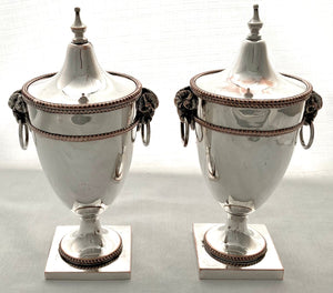 19th Century Pair of Silver Plate on Copper Ram Mask Covered Urns