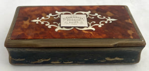 19th Century Horn Table Snuff Box with Tortoiseshell Cover and Ivory Inlay.