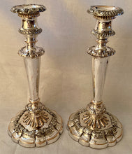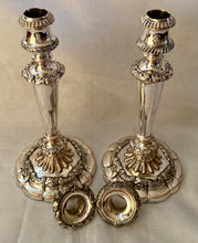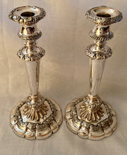 Late Georgian pair of Old Sheffield Plate ornate candlesticks, circa 1830. Raised on shaped circular feet with applied scroll decoration. The V shaped stems with applied decoration to the shoulders. There is some beautiful applied fluted decoration where the stem joins the base. The bases are plaster filled.