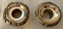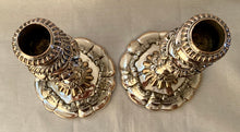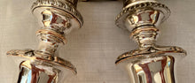 In good order. There is minimal loss of plate, with some warm copper bleed to the feet. The detachable nozzles are not an exact match and differ slightly. There is a crease to the top of one sconce and a slight gap where the shoulder joins the stem on one. These are clearly shown in the photos. Both stand perfectly straight