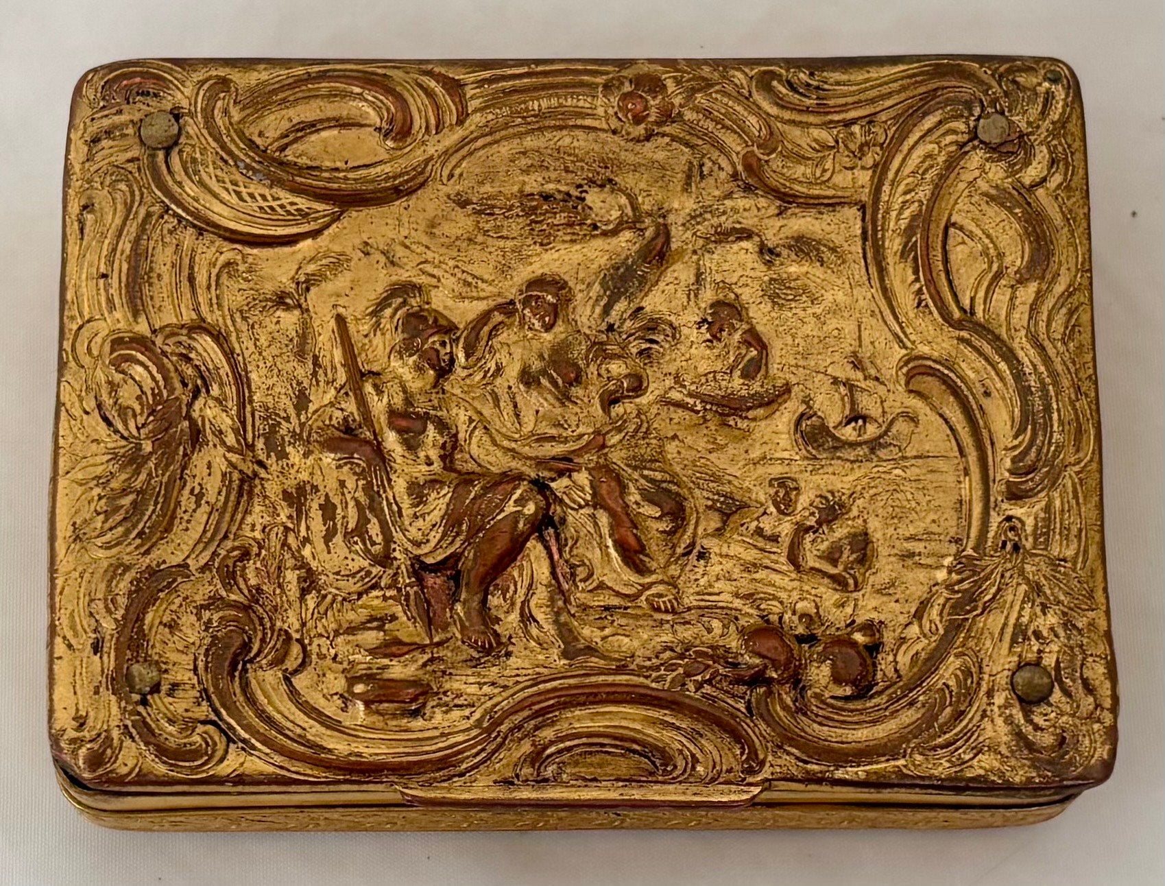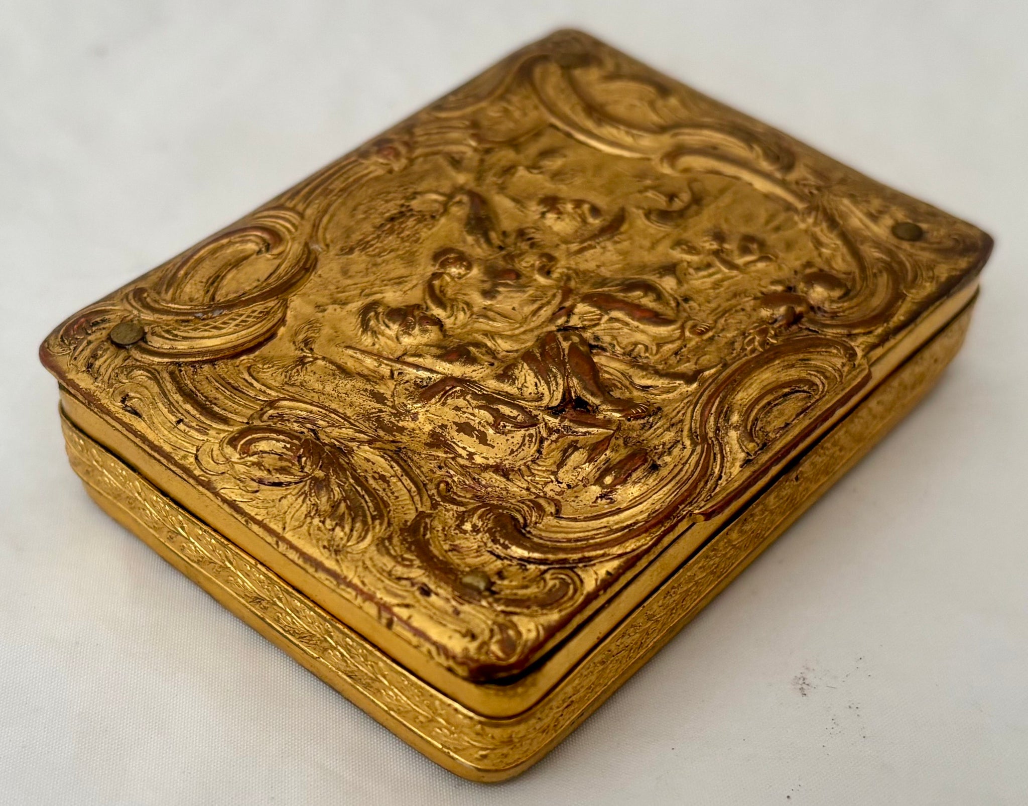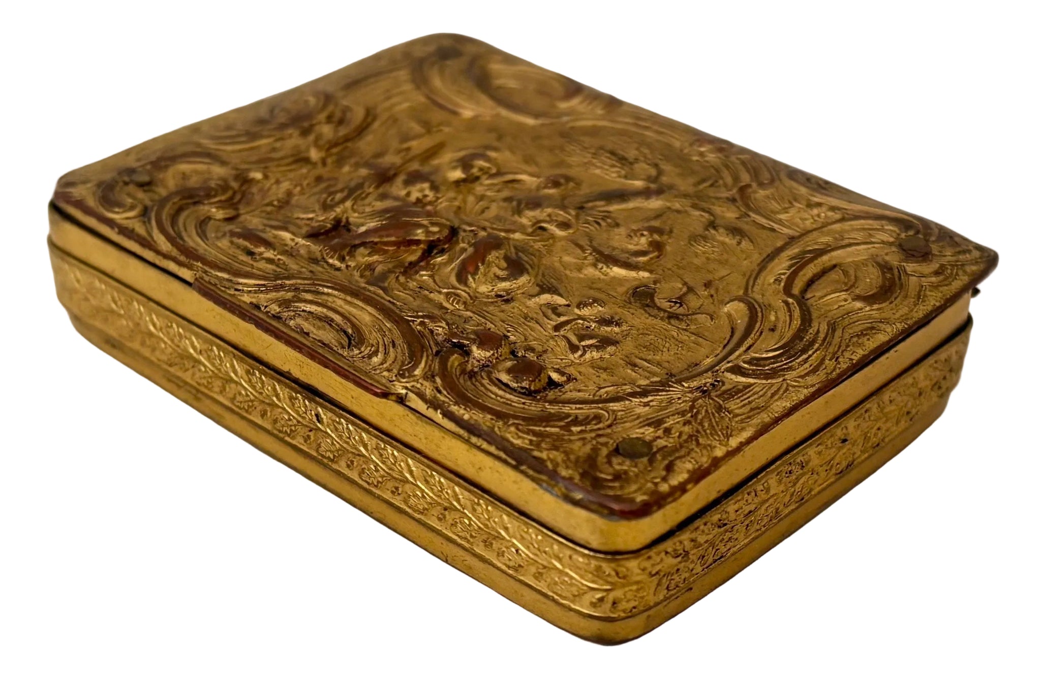 Mid 19th Century Gilt Metal Table Snuff Box with Neoclassical & Scroll Relief Detail Cover. The sides with a band of applied leaf detail. The cover is an applied panel.