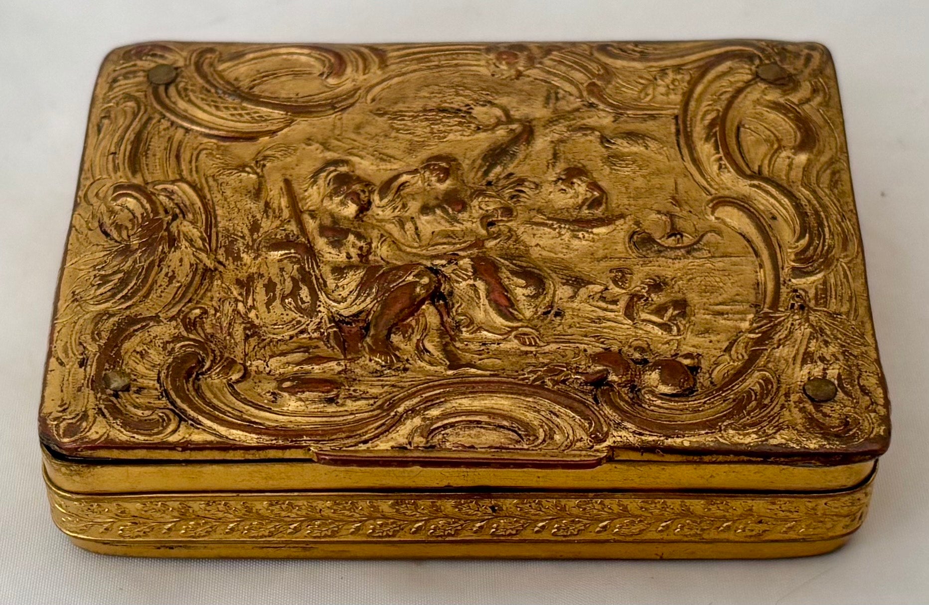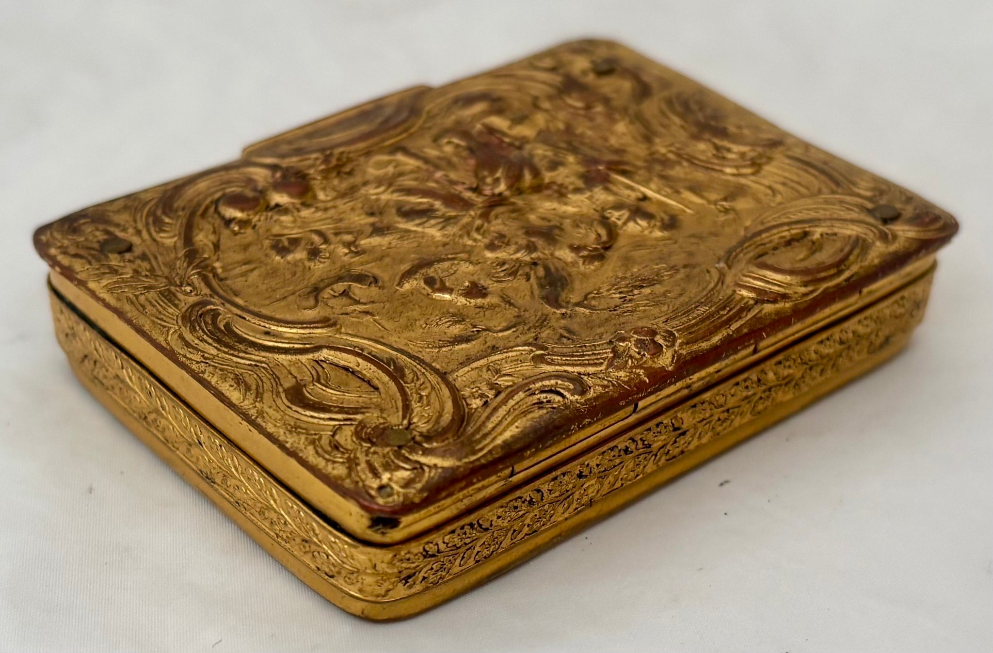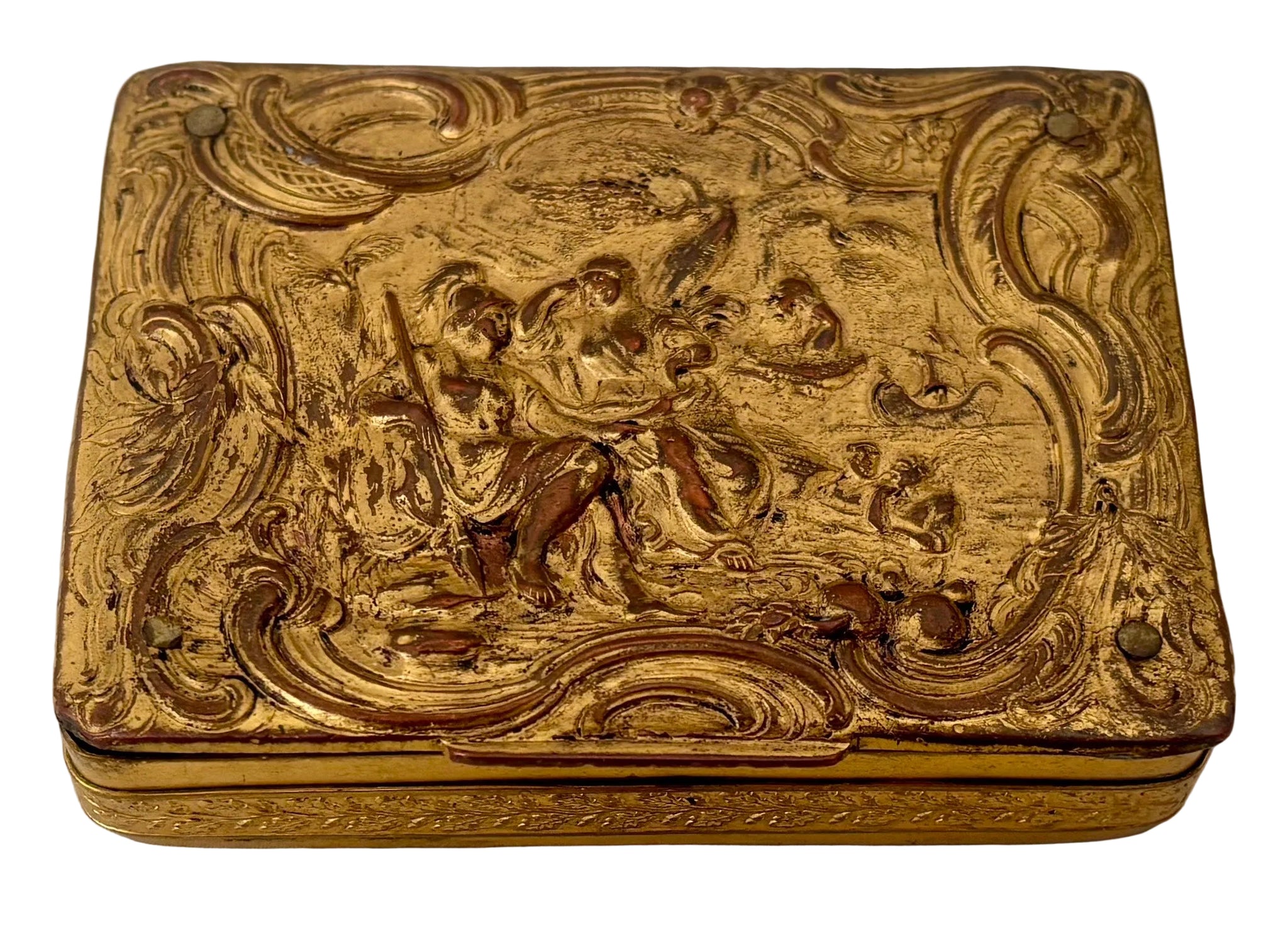 Mid 19th Century Gilt Metal Table Snuff Box with Neoclassical & Scroll Relief Detail Cover. The sides with a band of applied leaf detail. The cover is an applied panel.