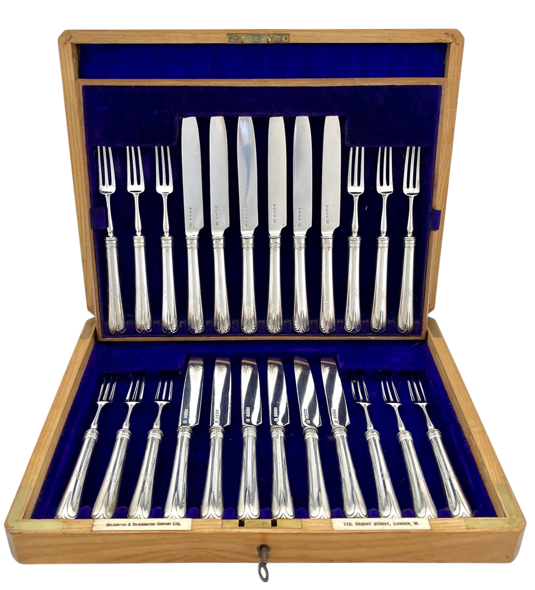 Victorian oak cased canteen of silver fruit knives and three prong forks for twelve persons. Each handle is monogrammed with the letter H along with the brass cartouche on the oak case. The fitted oak case is lined with purple velvet and satin. This canteen was retailed by The Goldsmiths and Silversmiths Company in Regent Street, London and their name is marked to the case interior.