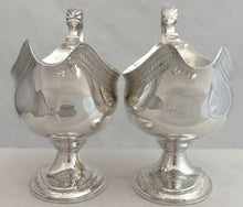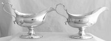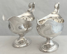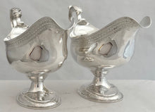 Georgian, pair of George III silver pedestal sauce boats. Features bright cut decoration and acanthus capped handles. There is a belt enclosed initial P to one side of each sauce boat.