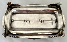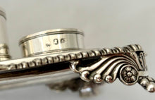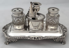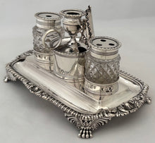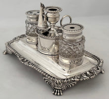 A George III Silver Inkstand. Features two cut glass ink bottles, two pen rests, wafer box, taperstick holder and snuffer. Of shaped rectangular form with a gadrooned, leaf and shell border. Raised on four ornate bracket feet.