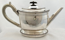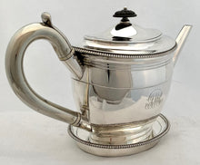 Georgian, George III, silver oval teapot and matching silver oval stand. The teapot has a straight spout and a scroll capped loop handle. Both the teapot and the stand have gadrooned borders. The stand is mahogany loaded in the base.