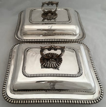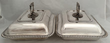 Georgian, George IV, Pair of Silver Entree Dishes & Covers. Of shaped, rectangular, form with gadrooned borders and ornate handles. Each dish cover has an identical crest with the motto 'FIRMA DURANT'. The handles are removable, allowing the covers to be used as serving dishes and more easily stored. All dishes, covers and handles are numbered 2 and 3.