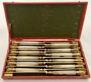 First Half 19th Century Cased Set of Twelve French Silver Gilt, Rose Gold & Carved Mother of Pearl Knives.