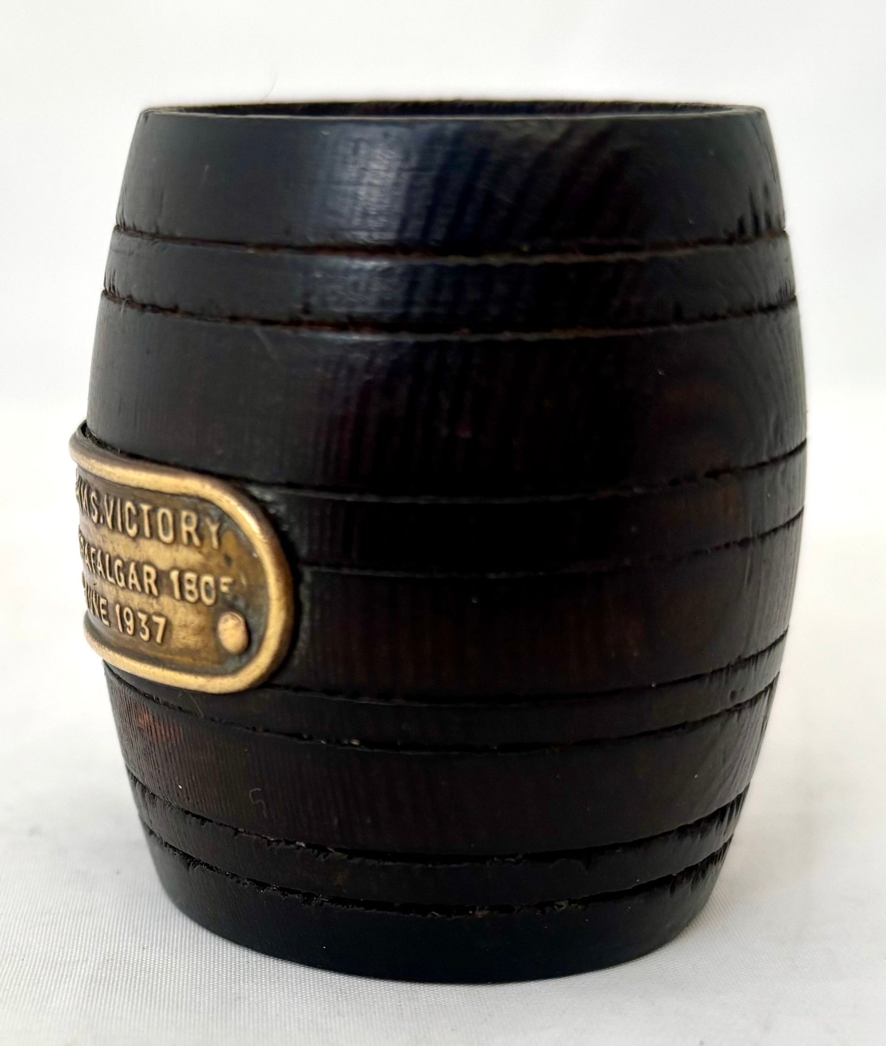 'From the Bowsprit of HMS Victory, Nelson's Flagship Trafalgar 1805, Purchased 2nd June 1937', a Novelty Matchstick Holder in the Form of a Wooden Barrel.