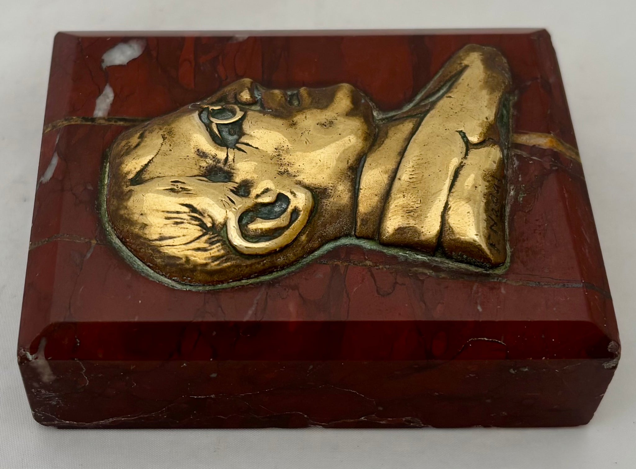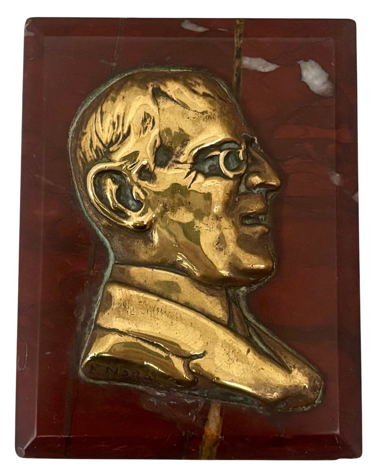 President Thomas Woodrow Wilson (1856 - 1924) Brass Portrait Profile Plaque Applied to a Red Marble Plinth. He was the 28th President of the USA and his term in office coincided with America's entry into World War One. Signed 'F Nadal' to the portrait bust.