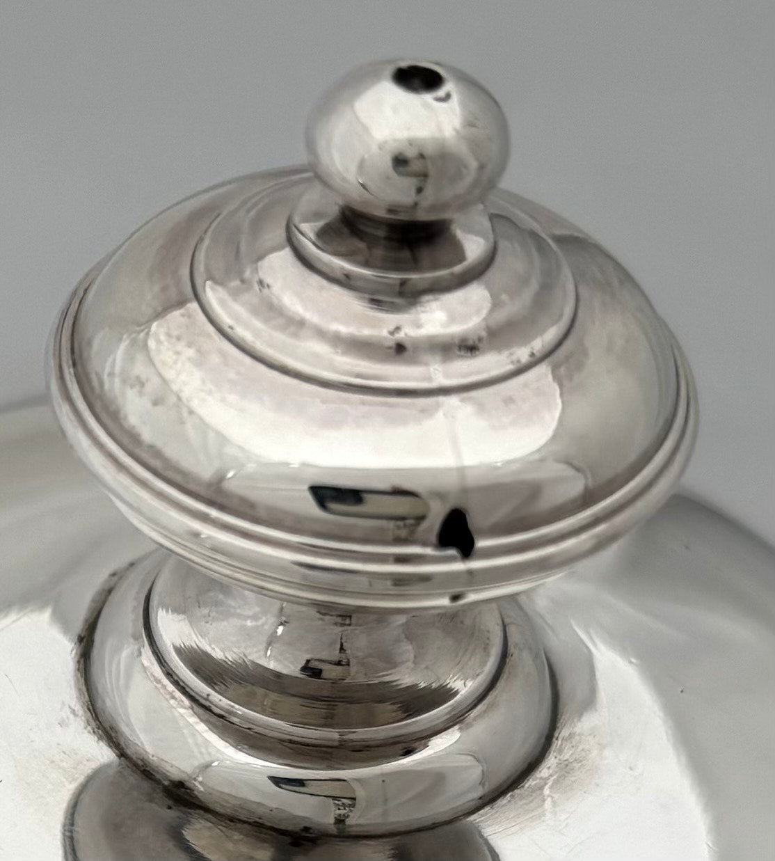 In good condition with some clouding (fire staining) of the silver. The turned cover finial with a hole at the side. Free of dents and creases. Solder marks to the underside of the base, but probably from construction. Age related surface wear.