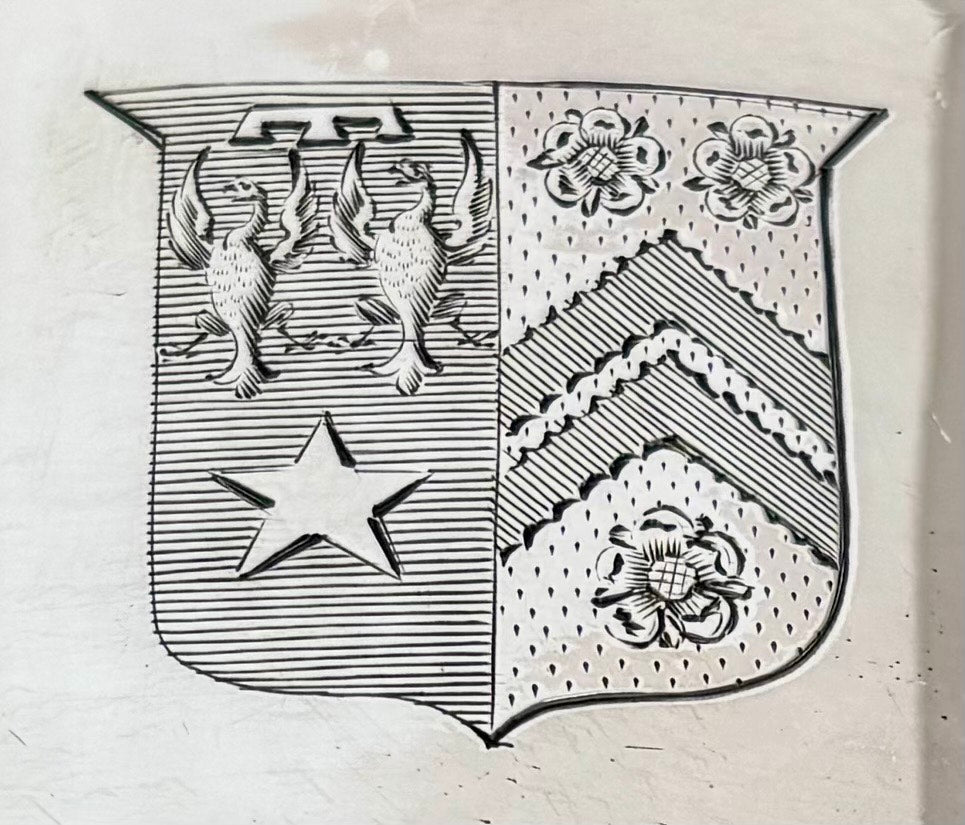 The arms commemorate the 1800 marriage of James Somerville Fownes, of Dinder House, Somerset and Frances Ilbert of West Alvington, Devon. A professional heraldry report accompanies this item.