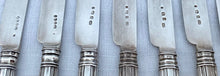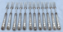 All of the forks are hallmarked for Sheffield 1826 by Aaron Hadfield. Eight of the knives are hallmarked for Sheffield 1822 by Aaron Hadfield and the remaining four are hallmarked for Sheffield 1825 by another silversmith, possibly with the initials SK.