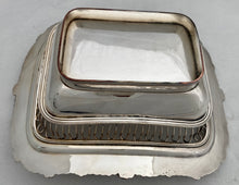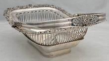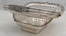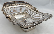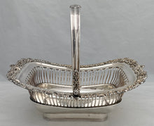 Early Victorian Silver Plated swing handled cake basket, circa 1850. Features a gadrooned border with foliate and scroll decoration. Raised on a reeded and rectangular foot. The main surface is solid with wirework sides.
