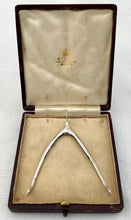 Asprey Edwardian cased pair of novelty silver wishbone sugar nips. The case is covered in burgundy Morocco leather and features the Asprey name and address to the interior.