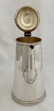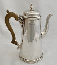 Elizabeth II, Asprey silver Georgian style coffee service. The coffee pot is of plain cylindrical form with a fruitwood handle and ogee domed cover with urn finial. The cream jug is of sparrow beak form whilst the sugar bowl is of plain round form without handles.