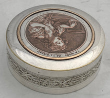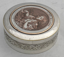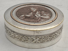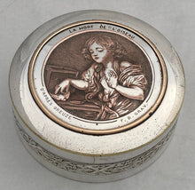 French Silvered Circular Table Snuff Box Engraved with 'La Mort de L'Oiseau', after Jean-Baptiste Greuze. Circa 1900. Of circular form with an engraved band of ribbon and leaf detail. The interior gilded and the cover beautifully engraved. F. B. Graz is most likely the engraver.