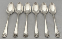 The spoons have bottom struck hallmarks for London 1759 by Isaac Callard. The date letter is only visible on one spoon, but the maker's mark is visible on all six spoons, as are the identical crests. All hallmarks have been photographed.