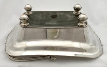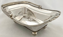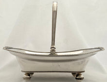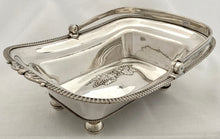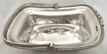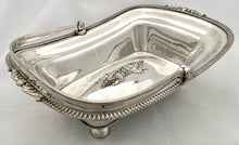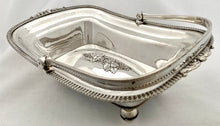Georgian Old Sheffield Plate fruit basket with bale handle on four orb feet. Features a central grape swag design to the base and a gadrooned and scrolled leaf border. The reeded bale handle stays in position and you can clearly see the rolled over silver edges, under the top rim and the join to the base. The underside of the base is tinned.