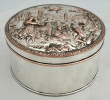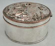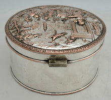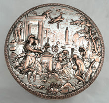 A Silver Plate on Copper Biscuit Box with Neoclassical Relief Detail Cover. The box probably dates to circa 1880 - 1910.