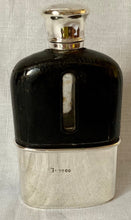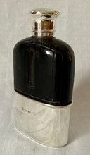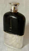 A rare and early Asprey, Victorian, silver and leather clad hip flask. The flask features a screw cap with a cork lined interior. The detachable silver cup fits snugly around a glass base, with the upper section covered in brown leather.