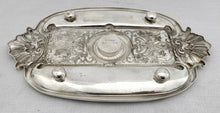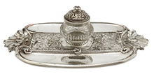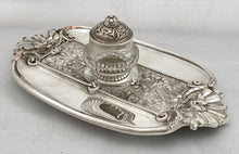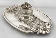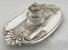 Victorian Silver Plated Inkstand. Elkington & Co., circa 1880. Relief detail of fruiting vines within a ropework border. Twin shell handles with leaf and scroll detail. The cental single inkwell is of eteched glass with an ornate pull off cover. Raised on four bun feet.